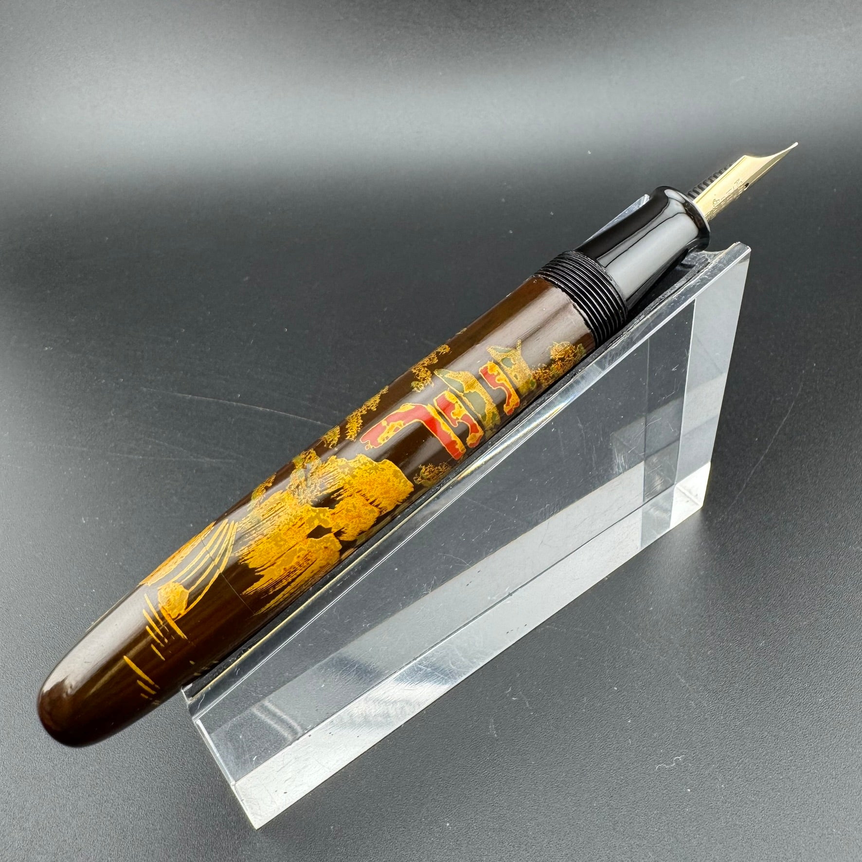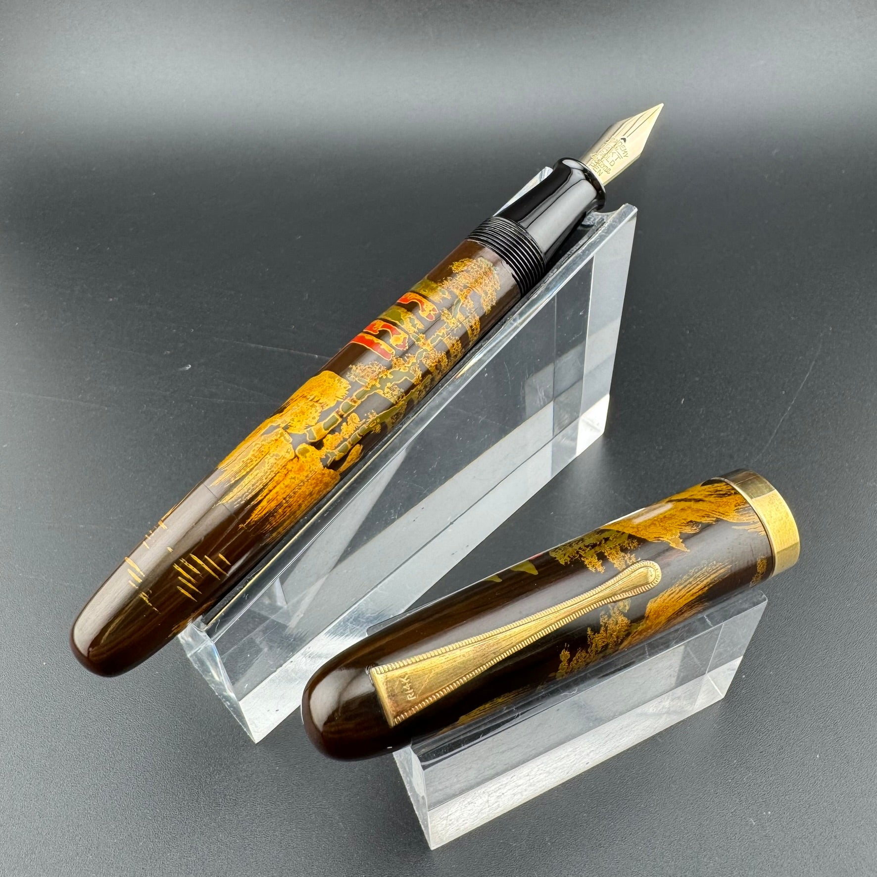 This pen features a beautiful Maki-e design depicting a Japanese temple and forest. Maki-e is the ancient Japanese art of using gold and other powdered metals in layers of urushi lacquer to create beautiful images. The word "Maki-e" literally translates to "sprinkle picture."