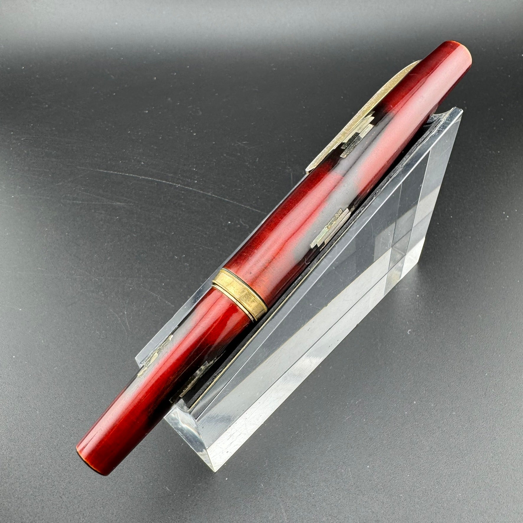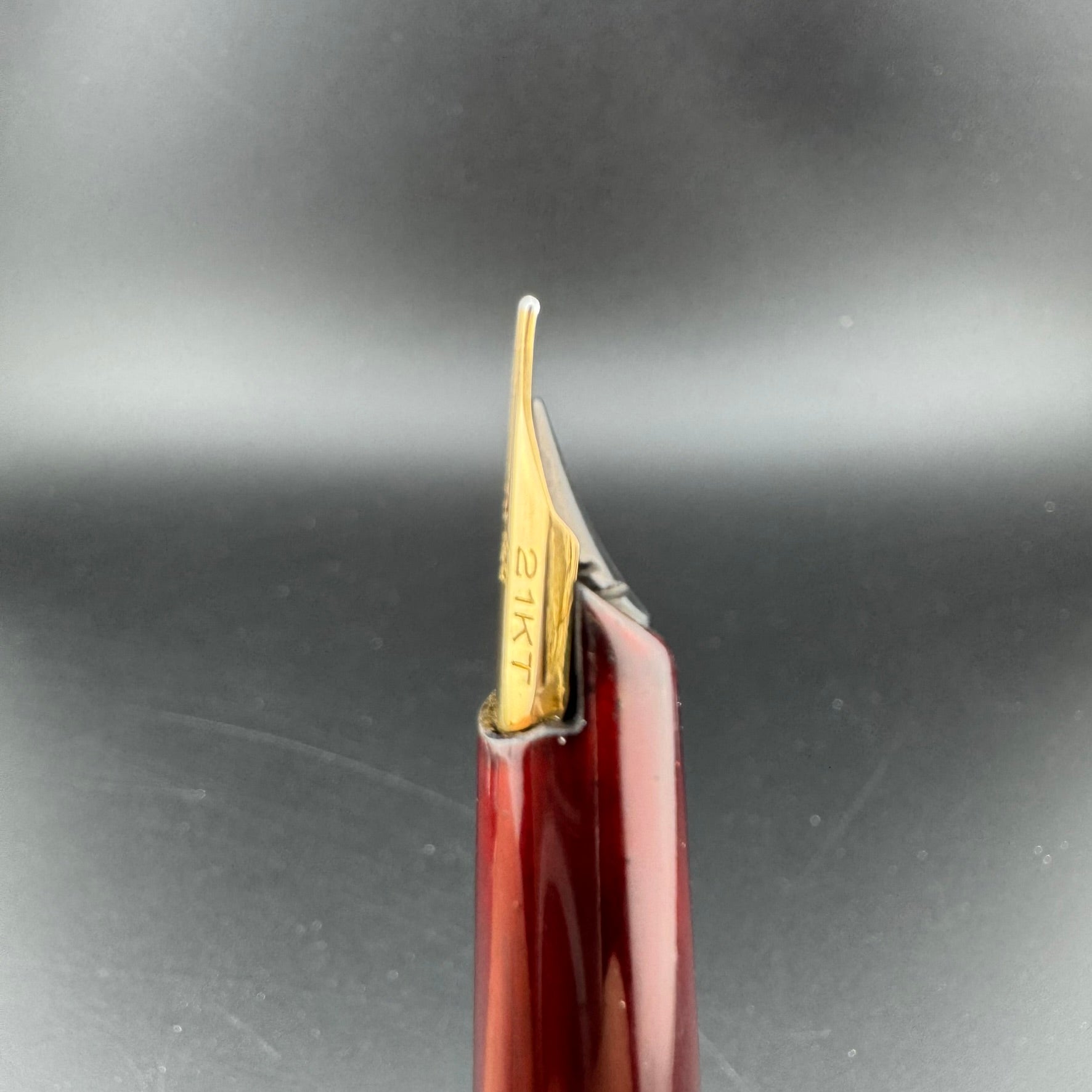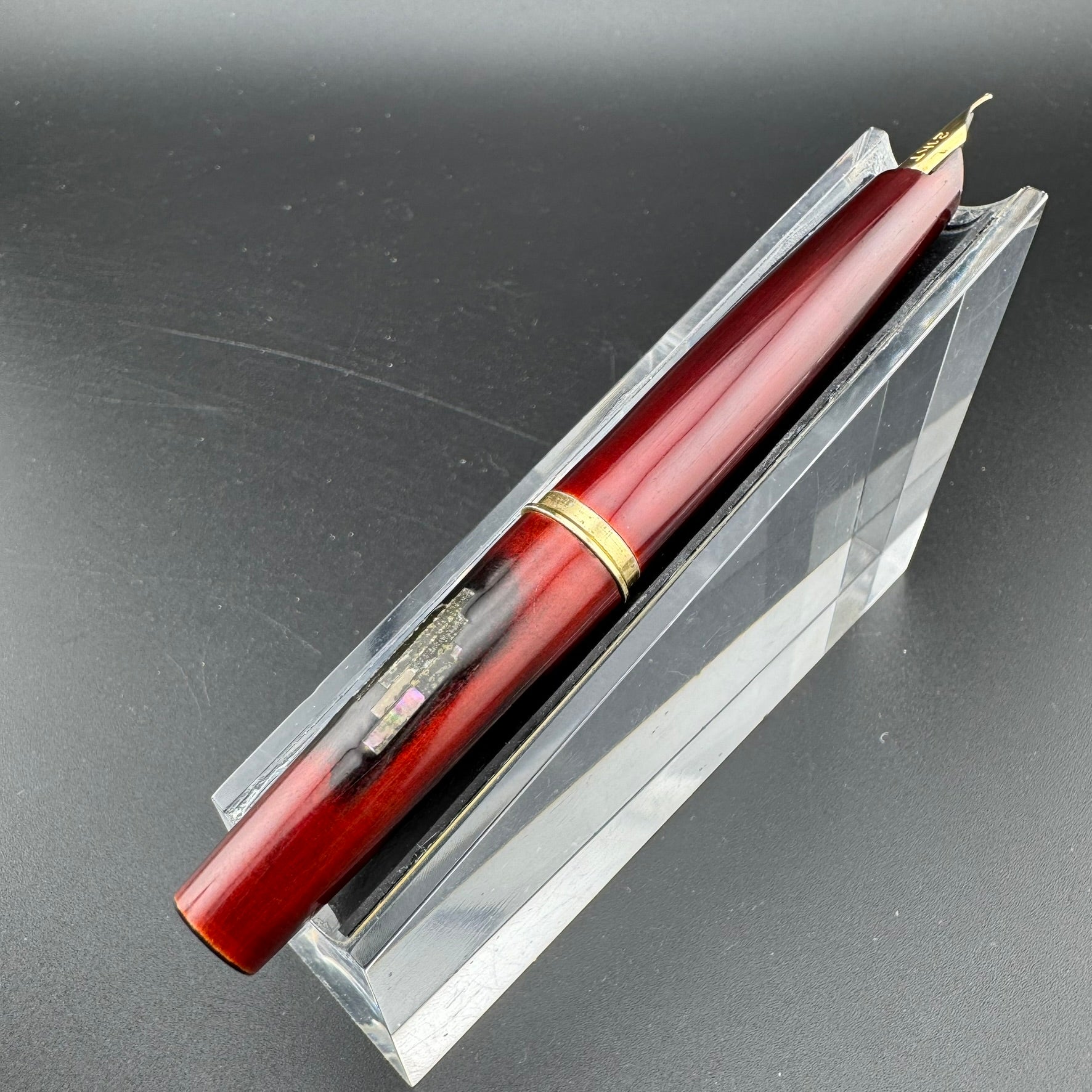 This is a Kumiai branded pen. Kumiai was a smaller Japanese fountain pen manufacturer. While small, it made some of the finest pocket pens with wonderful nibs and strong sense of design. The pens were produced by the same manufacturer that produced Parley and Yotsubisi pens, and often featured luxury finishing techniques like urushi lacquer, maki-e, raden, or Kamakura-Bori. Kumiai is much less common than other pocket pen manufacturers. A fine addition to any collection. This pen has a Platinum style cartridge interface, and will use those to fill.