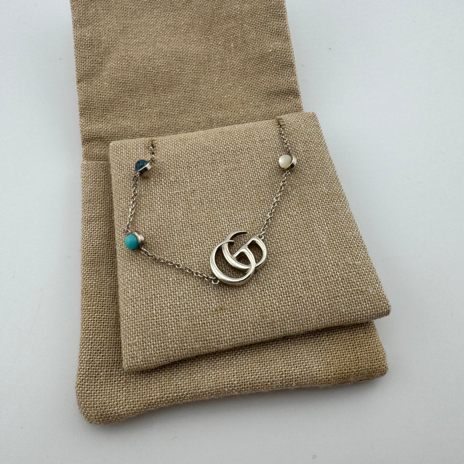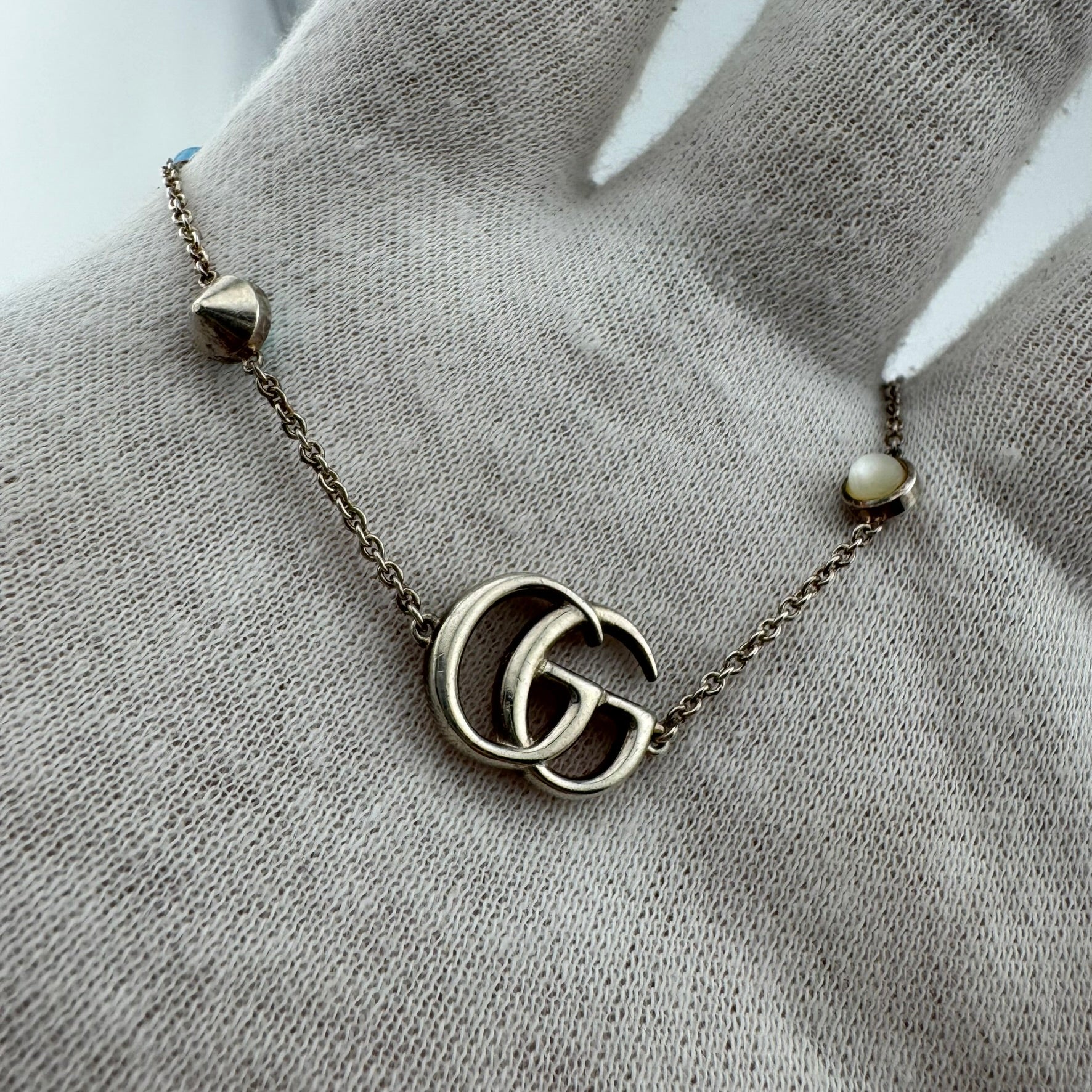 Pre-owned Gucci GG Marmont Jewel Bracelet. This bracelet features 925 Sterling Silver construction and four beautiful Gucci jewels. Overall, this piece is in B, Good Condition. Minor scratches ands cuffs can be seen in the sterling silver. This piece comes with the original box and Gucci authenticity guarantee.