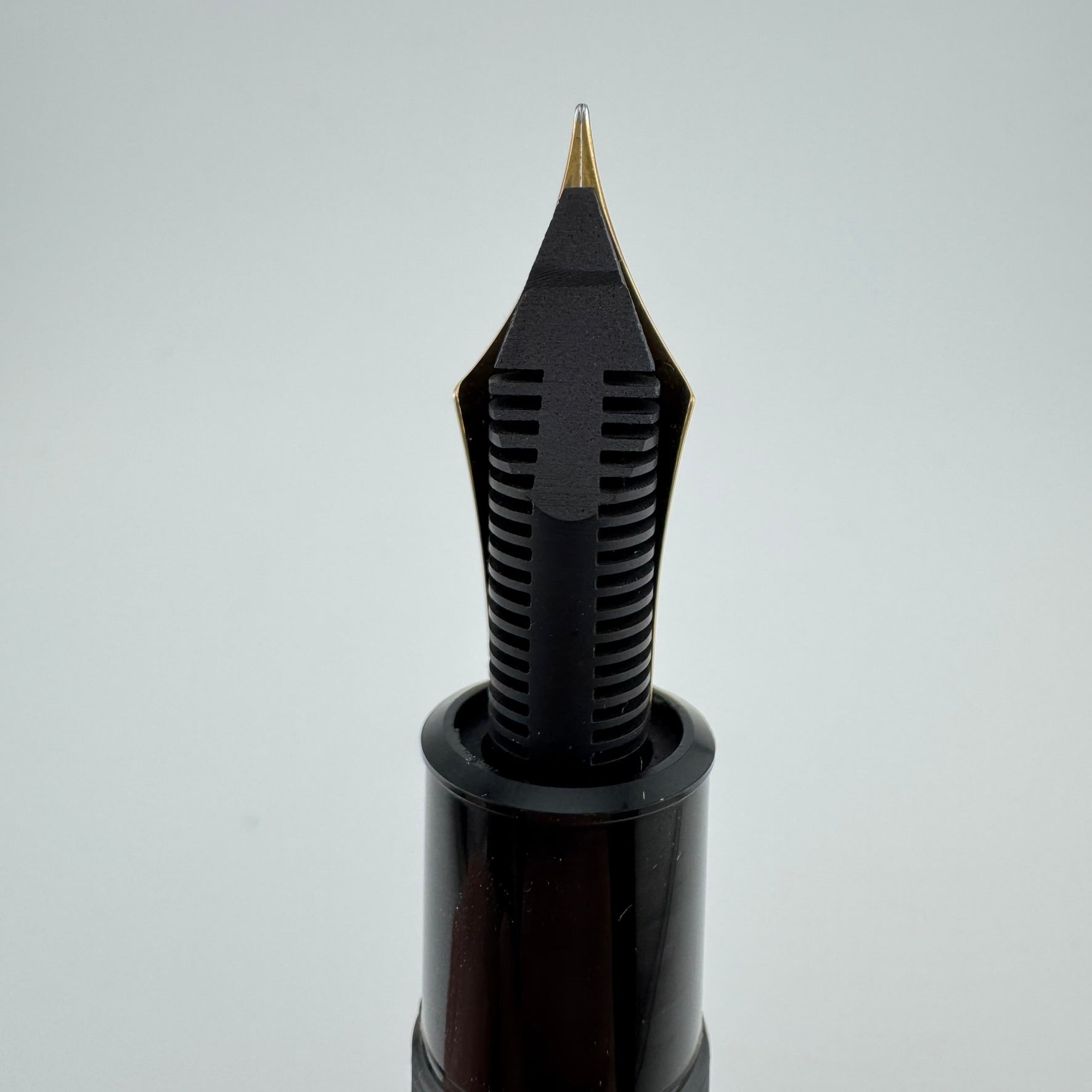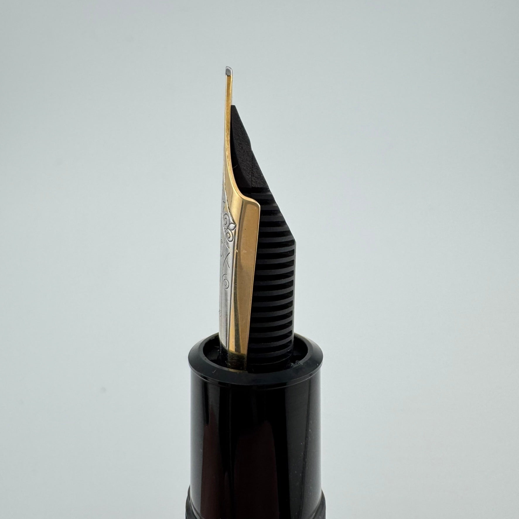 Montblanc 149 fountain pens can be dated by identifying a few key differences between the nibs and feeds. This pen was produced sometime between 1976 and 1982 due to the 14C Two-Tone nib and split ebonite feed.