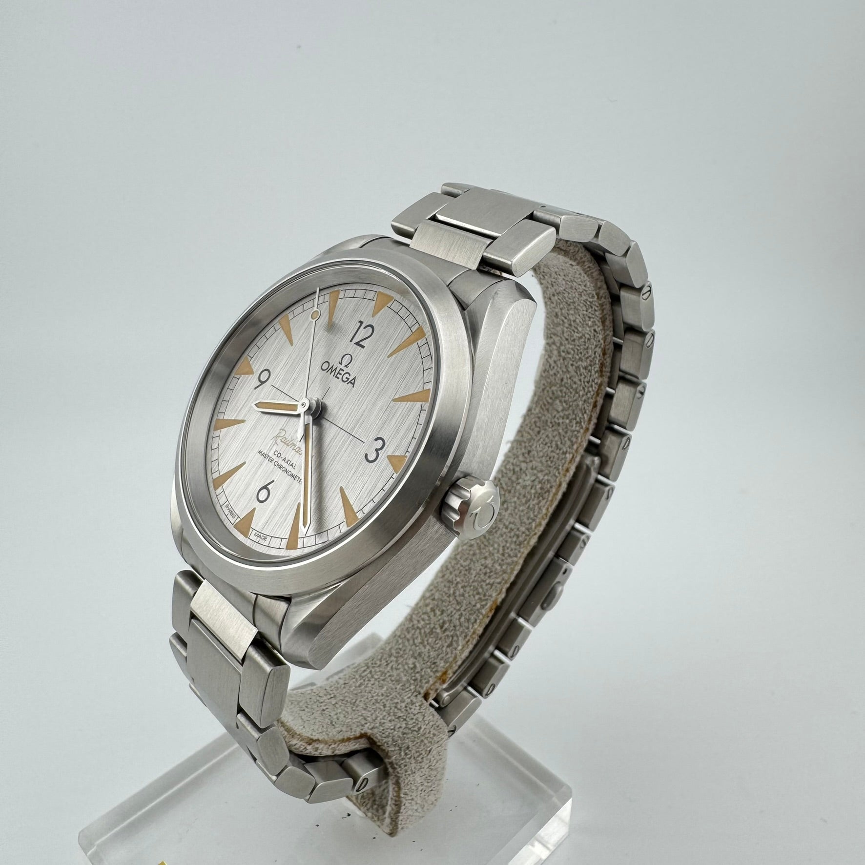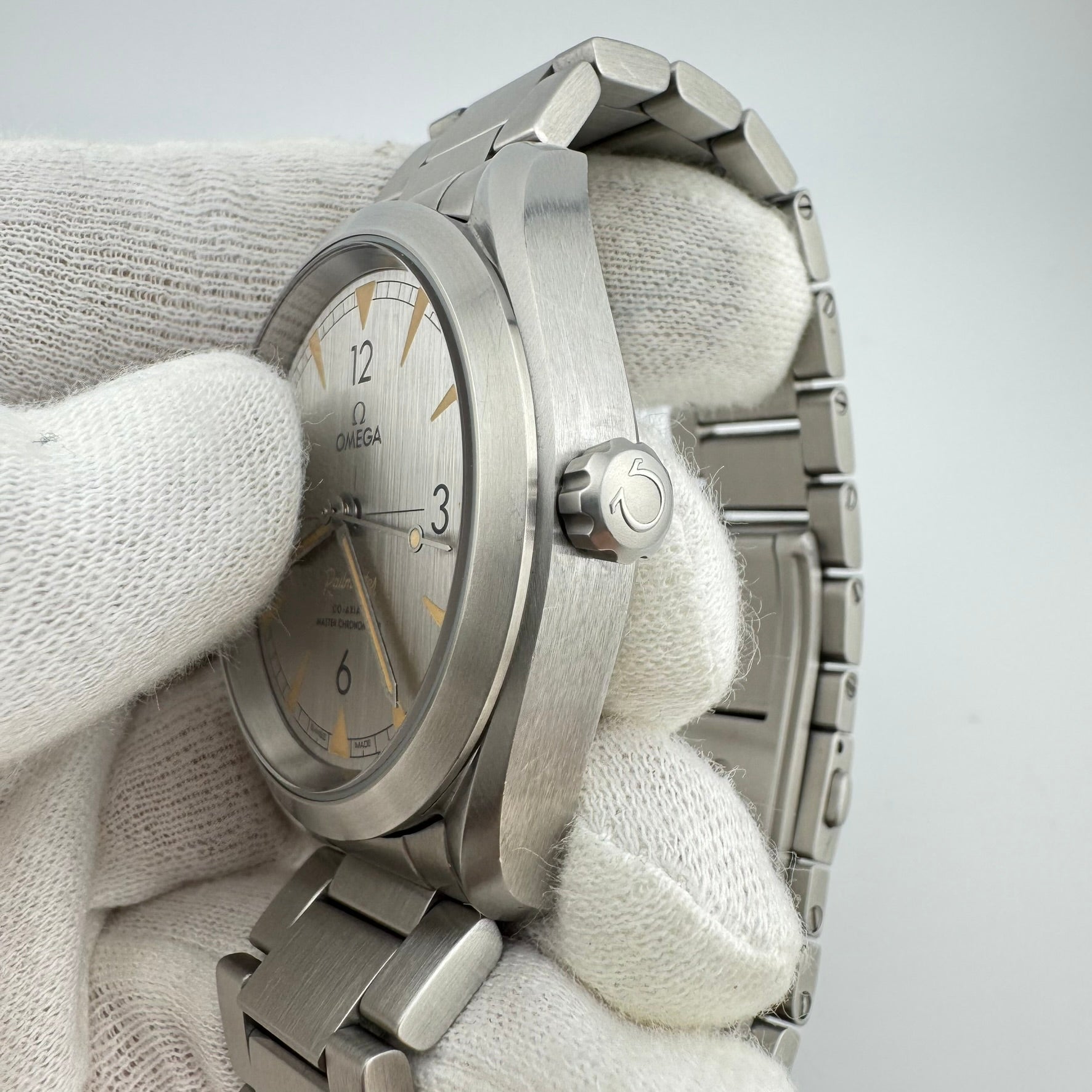 Pre-owned Omega Seamaster Railmaster Automatic Men's Watch. Reference 220.10.40.20.06.001. Overall, this watch is in A+ Excellent condition. This watch features a brushed silver colored dial and cream colored lume to give the watch a vintage feel. The watch comes with the original boxes, cards, user manual, and bracelet links. All links are installed in the watch except for one. The screws for the final link are missing. Replacements have been ordered and will be shipped along with the watch, or separately at a later date if the watch is purchased before they arrive.