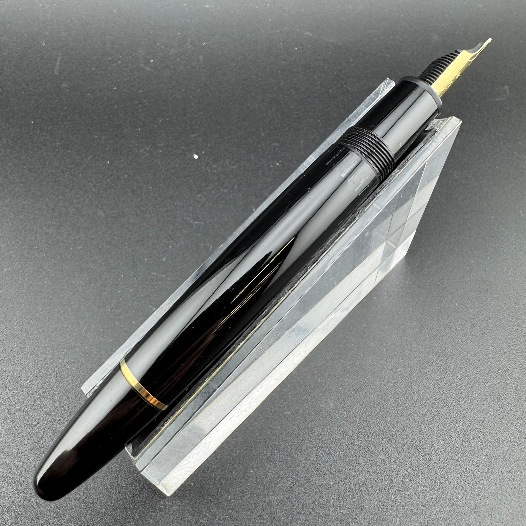 This pen features a 14K Gold Mono-tone Broad Nib. The pen is in (C) Fair condition. There is a small hairline crack in the cap. This does not affect functionality.