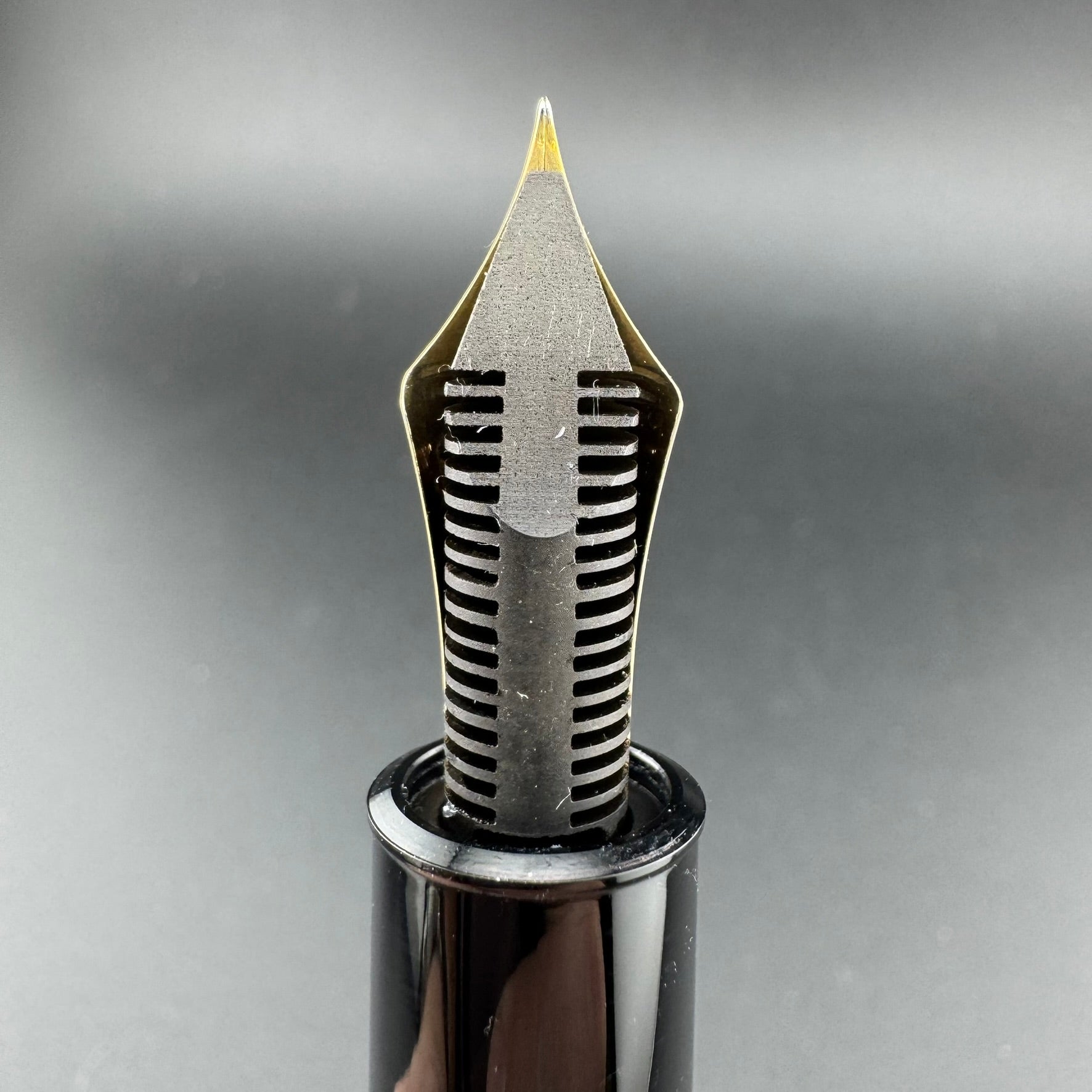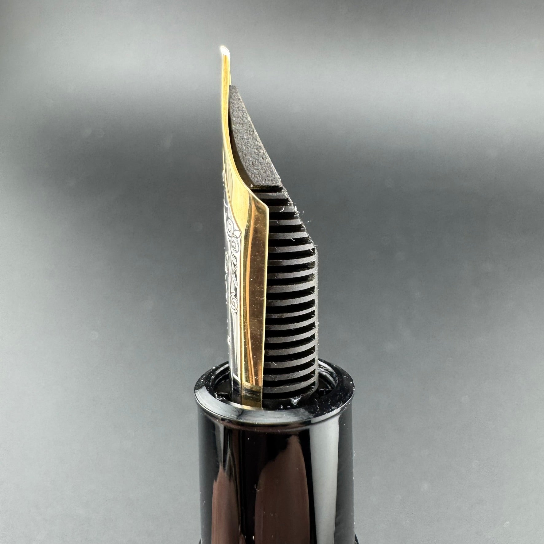 Montblanc 149 fountain pens can be dated by identifying a few key differences between the nibs and feeds. This pen was produced sometime between 1975 and 1976 due to the two-tone nib and solid ebonite feed.