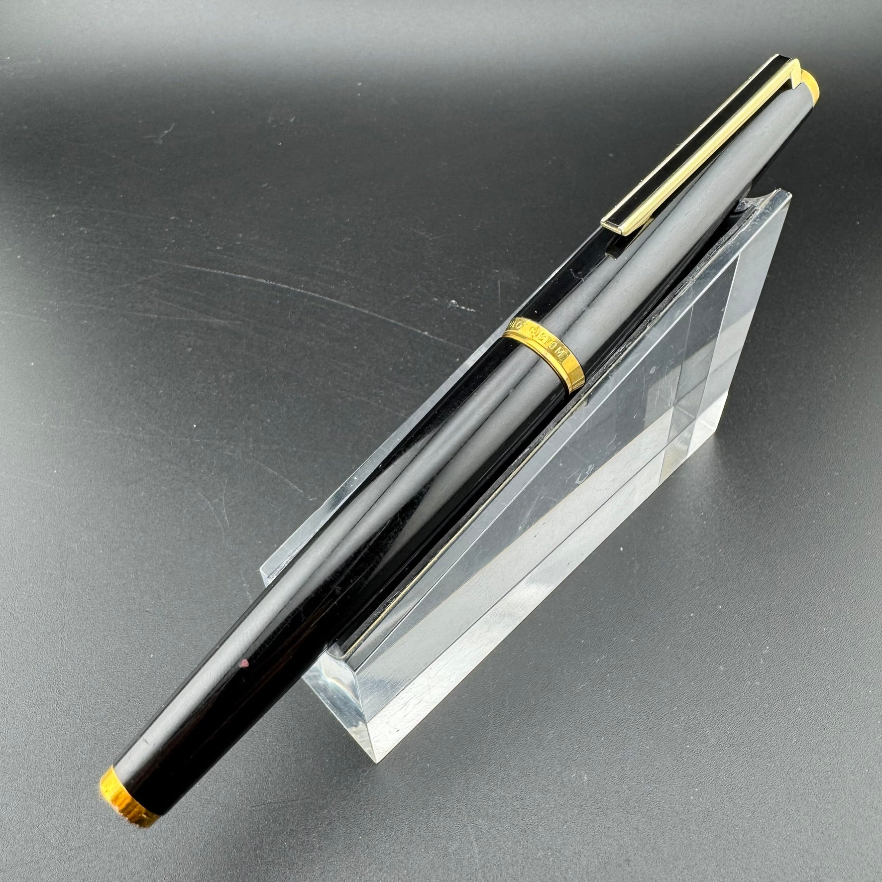 The Pilot Custom K series of pens, released in 1971, consists of three pens, each created to look different but with the same intent. The pens can be found as a stainless steel pen with black chrome stripes running along its body down to the nib (K-500SS), a sterling silver pen with a checkered body (K-1000SS), and a pen created with gorgeous wood from painted maple trees (K-500KS). These different styles of pens were created to give a sense of individuality to each person who bought one, and they continue to live up to their duty today. The Custom series grew to be one of the most popular Pilot fountain pens and has been produced in a variety of styles and finishes. It is these three pens that started the line. The black resin K-500RS was introduced to the market in 1972.