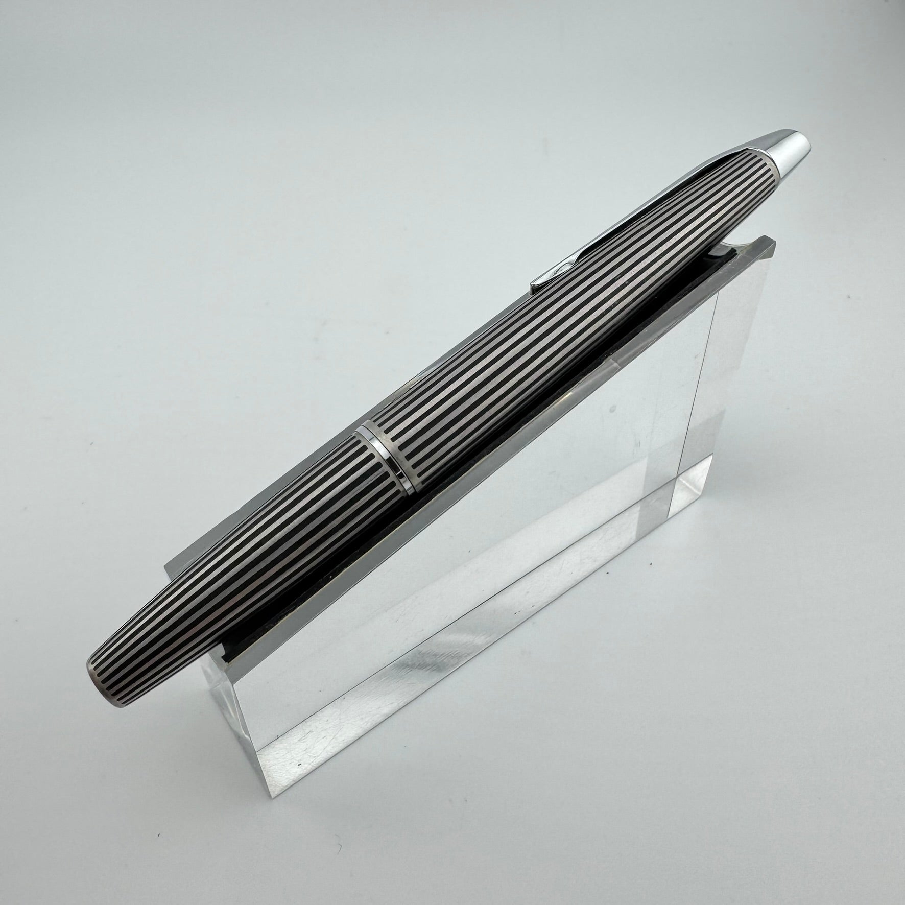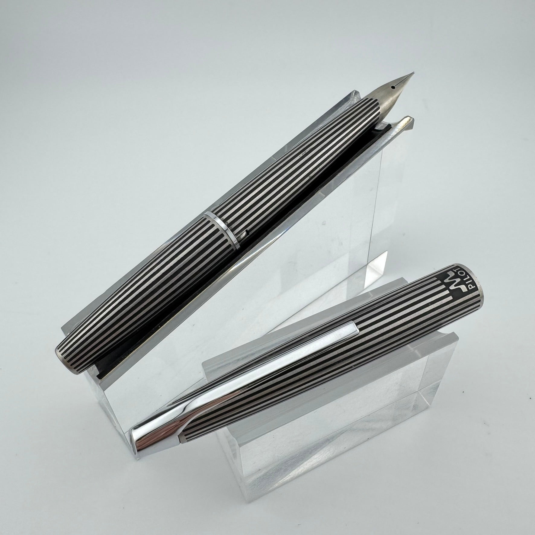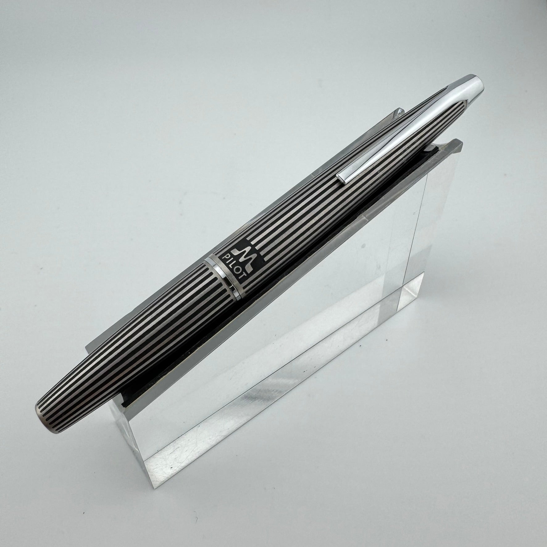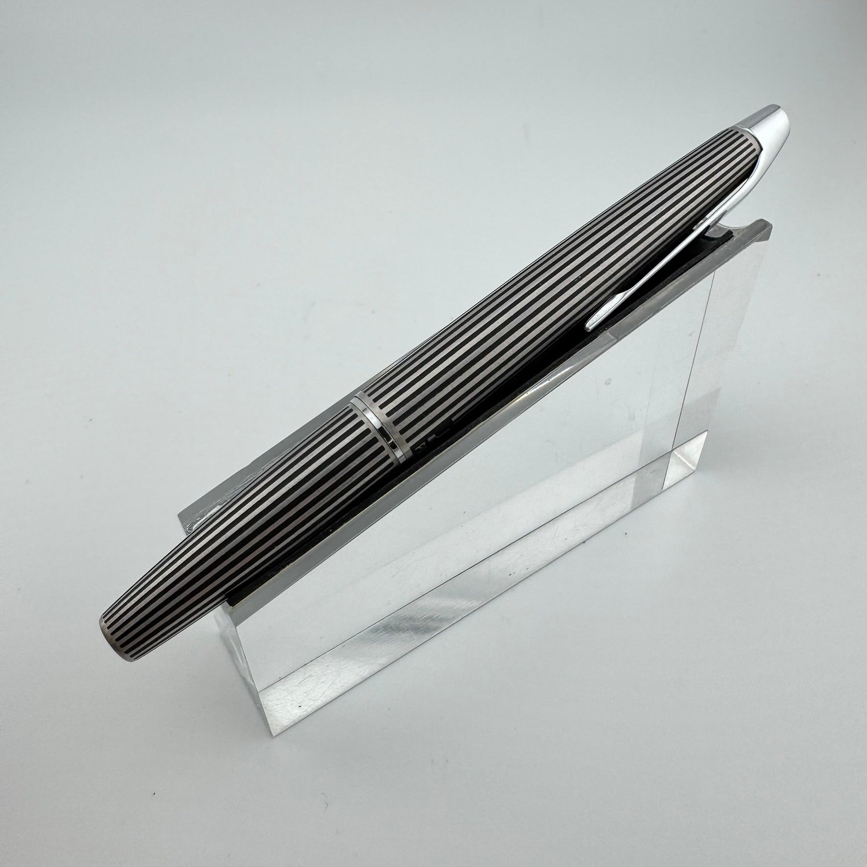 Introduced in 1971, the Myu was Pilot's response to Parker's innovative T1 fountain pen. Equipped with a streamiled stainless steel nib integrated right into the grip section, the Pilot Myu earned the title "The Concorde of Pens" due to its striking resemblances to the sleek supersonic airliner. The Myu 701 family was offered as a fountain pen (M-350SS), ballpoint pen (BPG-200SK), mechanical pencil (HMF-200SK) and a felt-tipped Signature pen (SW-100SC). This Myu is the rare "Black Stripe" variant. It features lines engraved along the body that are filled with black lacquer.