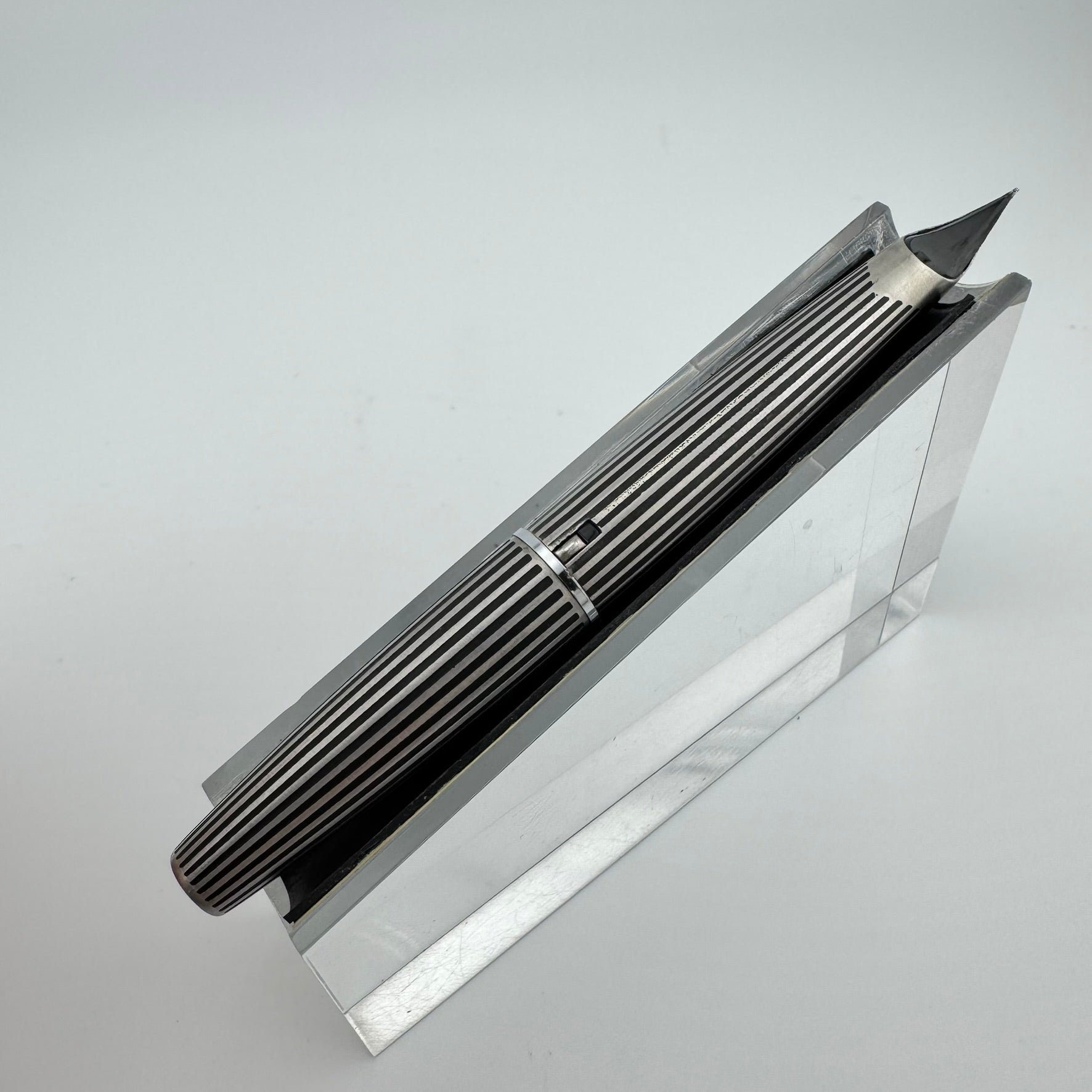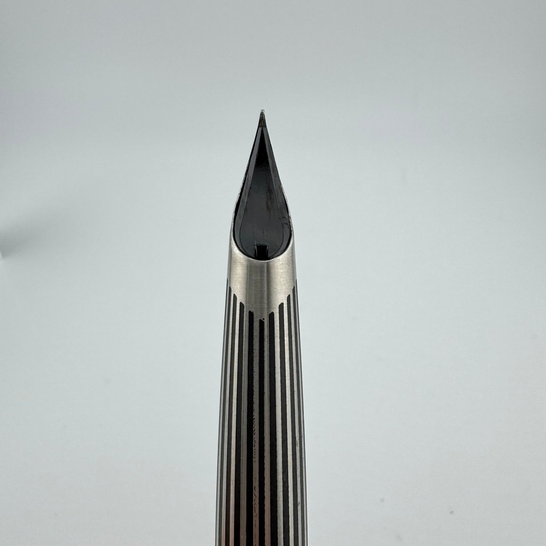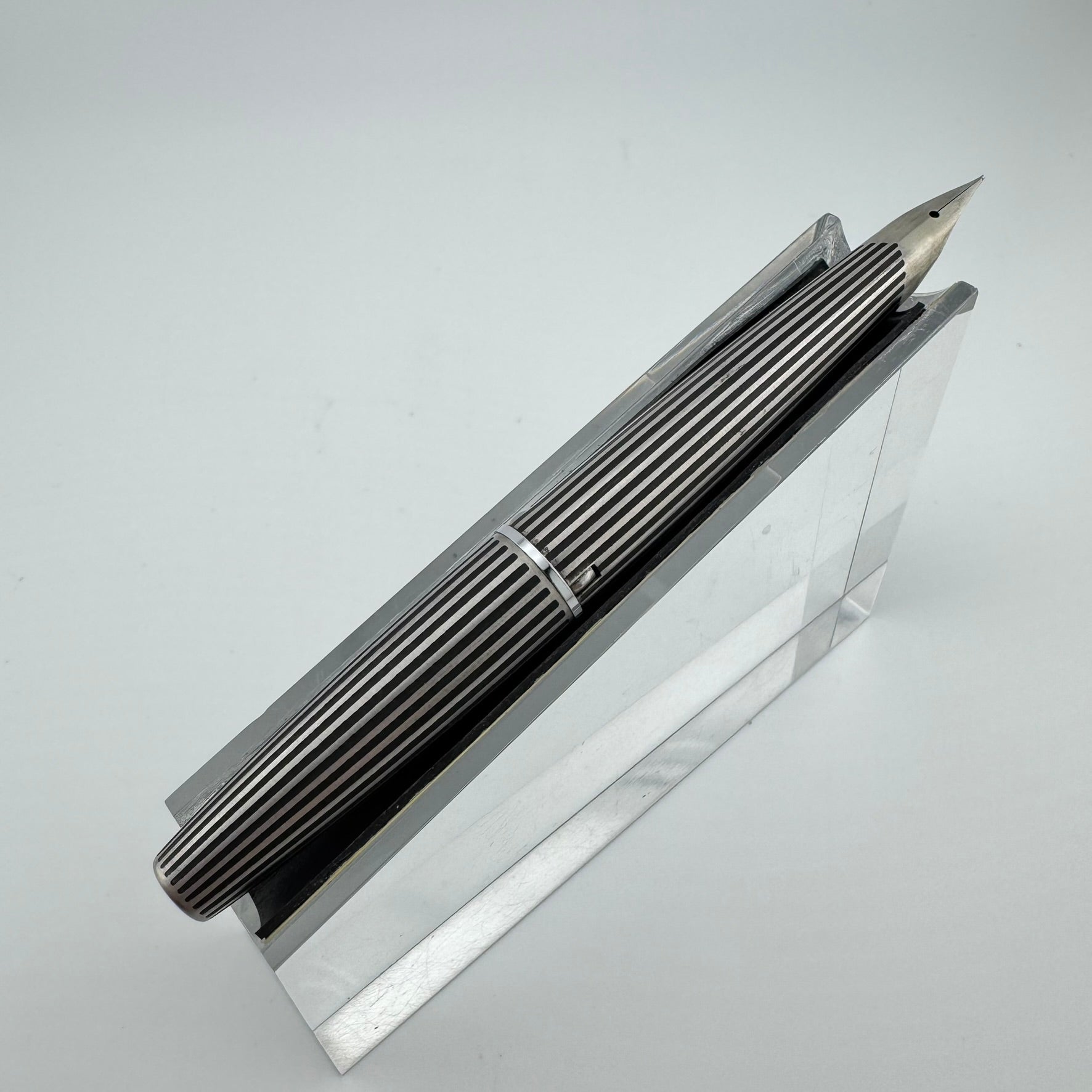 Introduced in 1971, the Myu was Pilot's response to Parker's innovative T1 fountain pen. Equipped with a streamiled stainless steel nib integrated right into the grip section, the Pilot Myu earned the title "The Concorde of Pens" due to its striking resemblances to the sleek supersonic airliner. The Myu 701 family was offered as a fountain pen (M-350SS), ballpoint pen (BPG-200SK), mechanical pencil (HMF-200SK) and a felt-tipped Signature pen (SW-100SC). This Myu is the rare "Black Stripe" variant. It features lines engraved along the body that are filled with black lacquer.