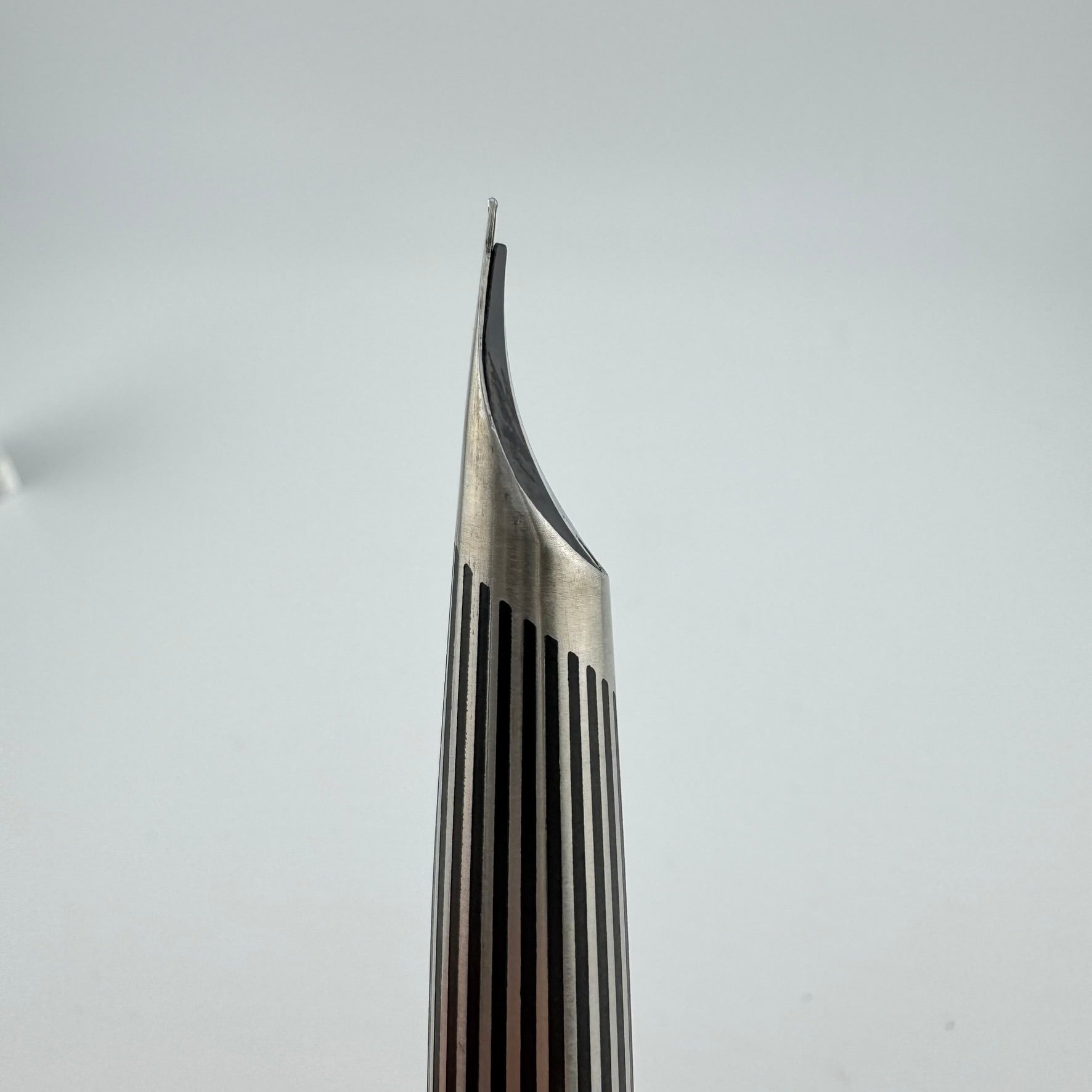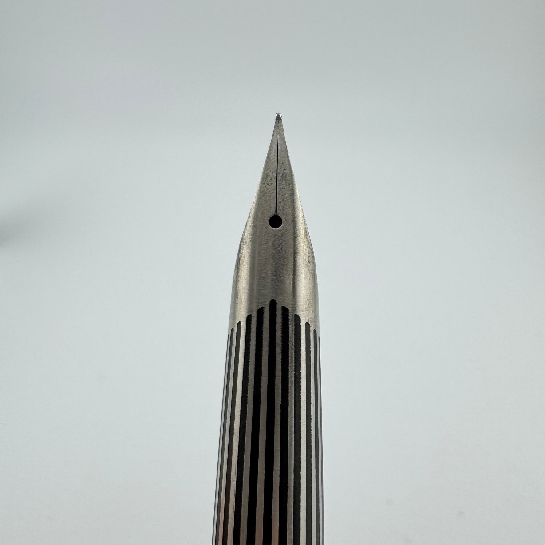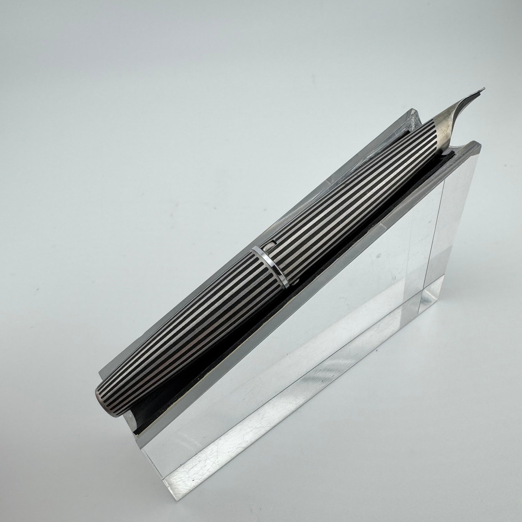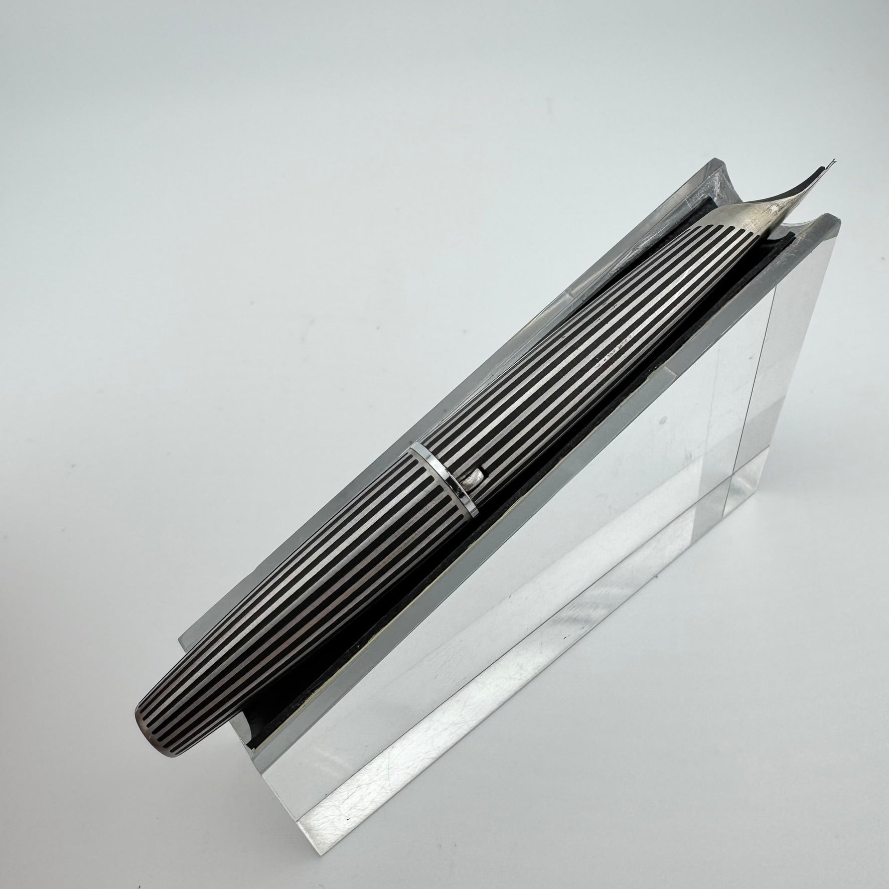 Introduced in 1971, the Myu was Pilot's response to Parker's innovative T1 fountain pen. Equipped with a streamiled stainless steel nib integrated right into the grip section, the Pilot Myu earned the title "The Concorde of Pens" due to its striking resemblances to the sleek supersonic airliner. The Myu 701 family was offered as a fountain pen (M-350SS), ballpoint pen (BPG-200SK), mechanical pencil (HMF-200SK) and a felt-tipped Signature pen (SW-100SC). This Myu is the rare "Black Stripe" variant. It features lines engraved along the body that are filled with black lacquer.