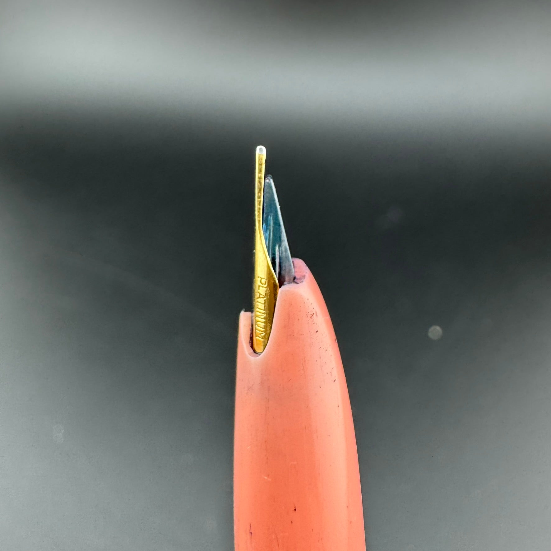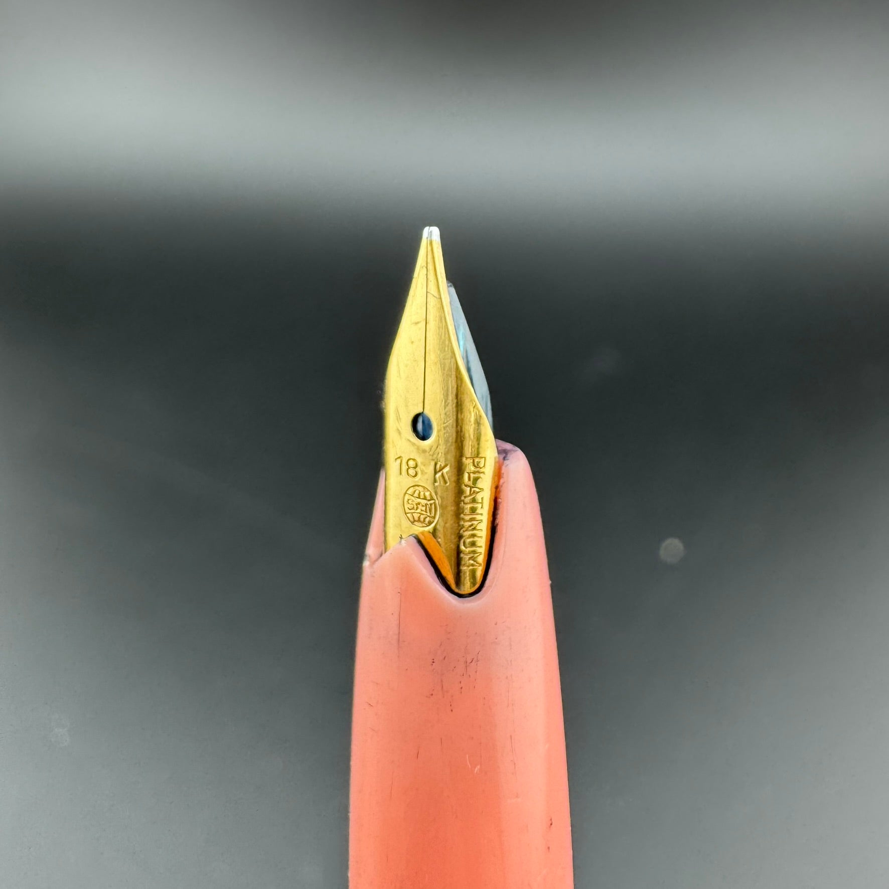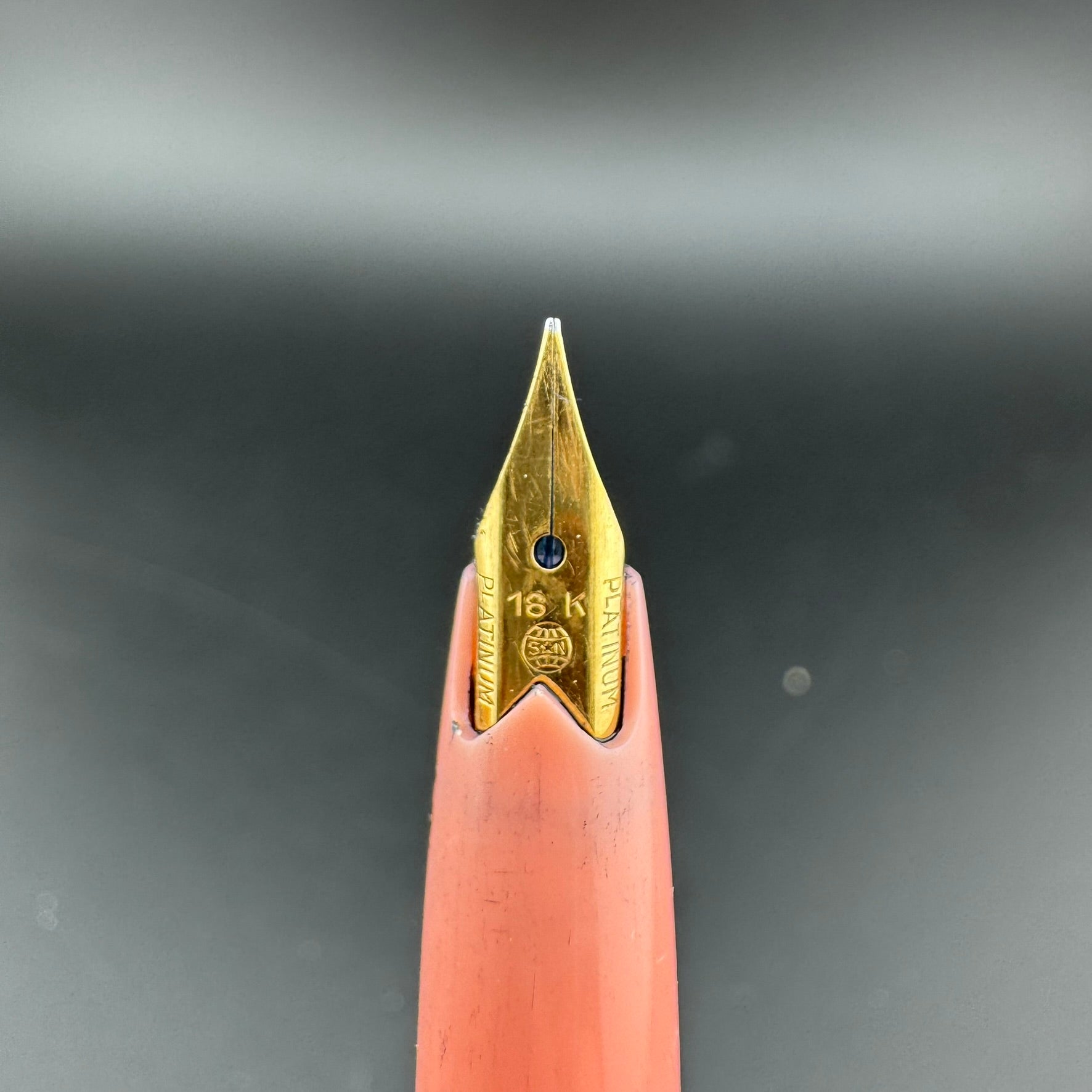 Platinum nibs are usually made out of 18K gold, but can sometimes be found with 14K, 22K, and even 23K gold in pens produced at the height of the karat wars. They are marked with Chinese symbols known as "Kanji" which indicate the nib size. By translating these symbols, we can properly determine the nib size of each pen.