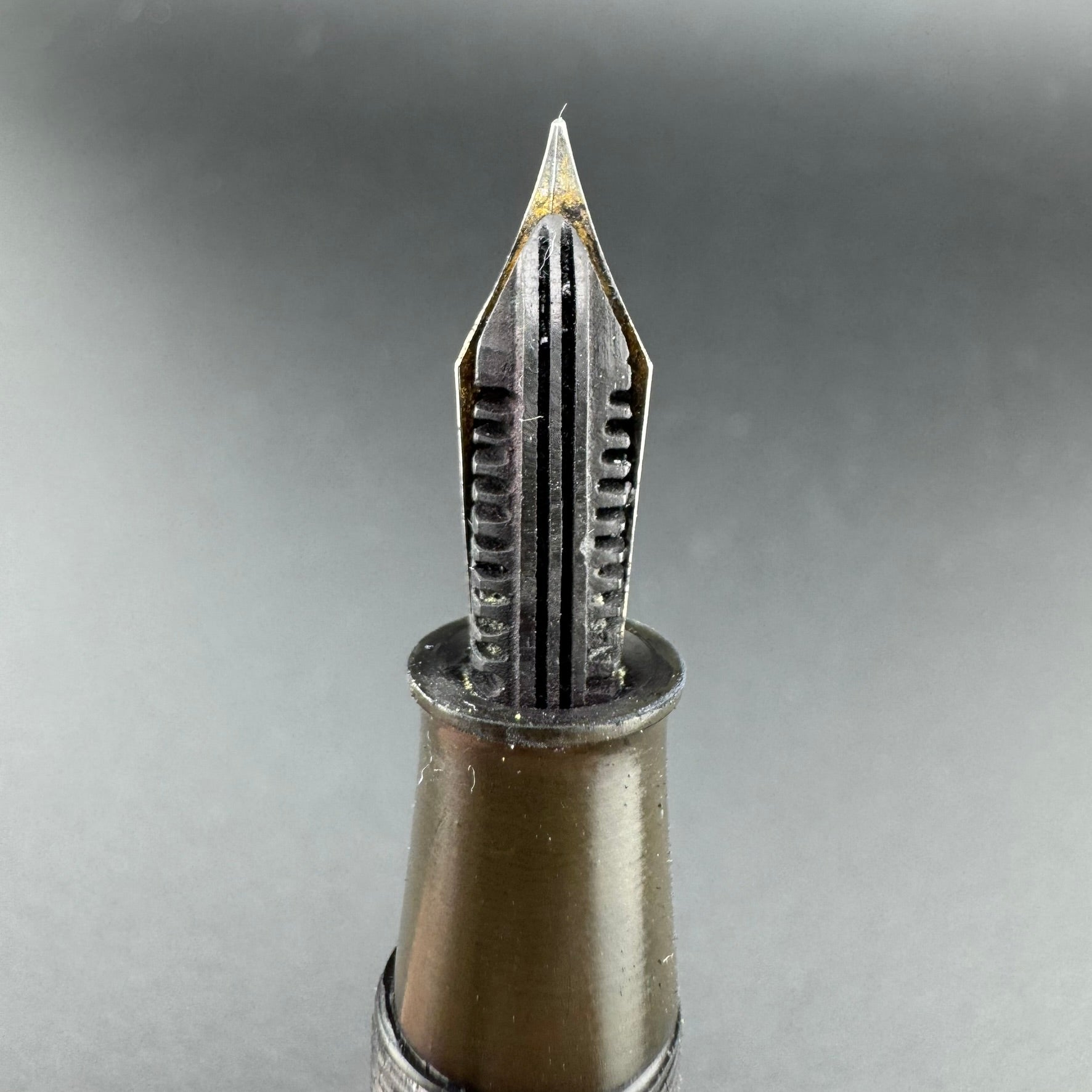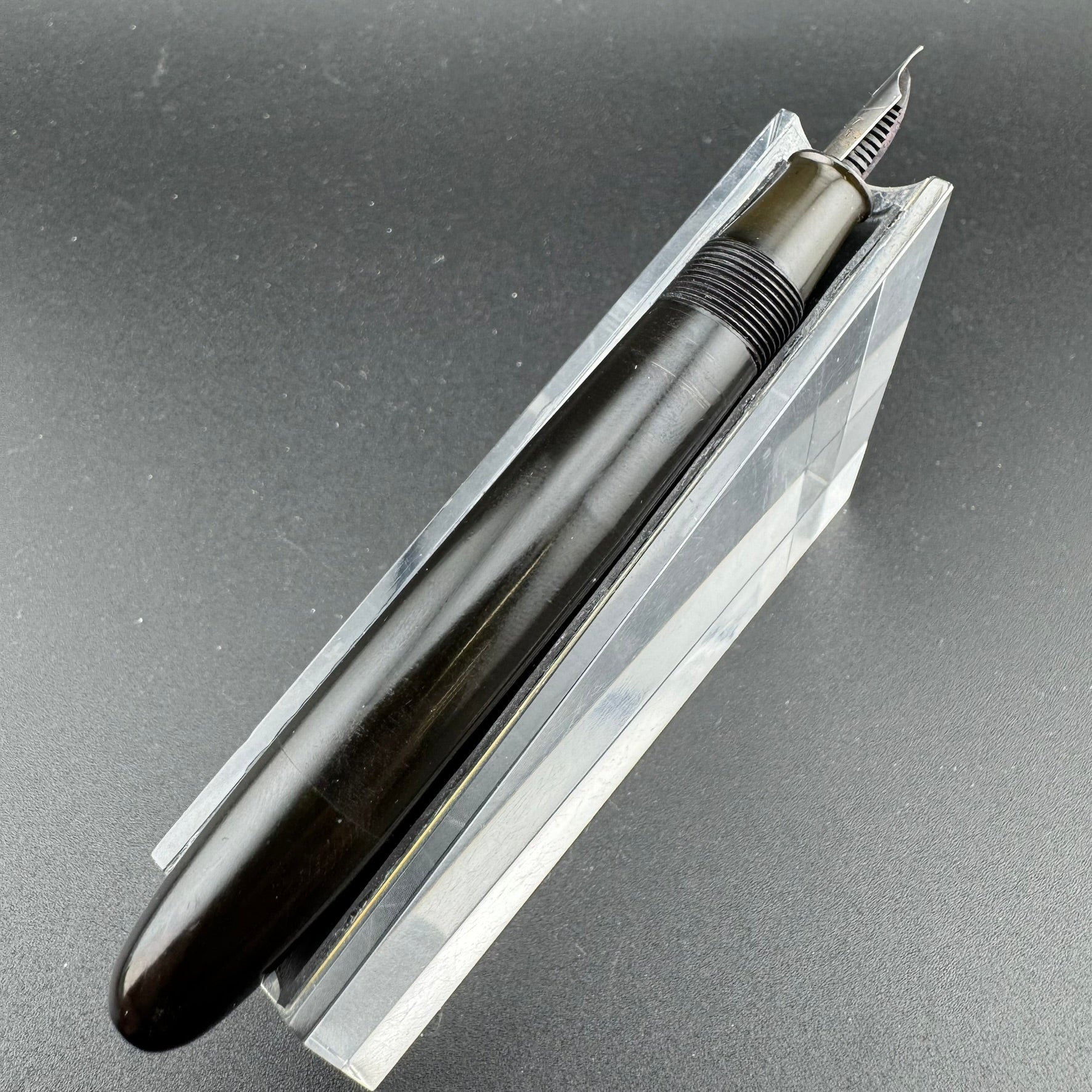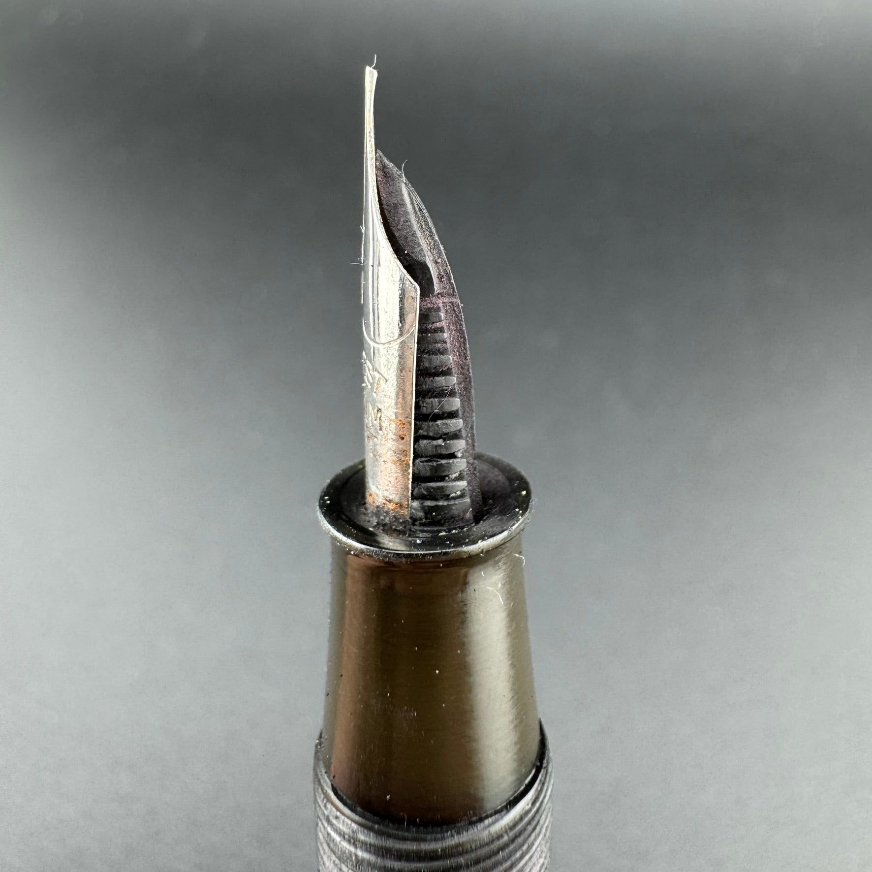 This pen has had the worn out, original cork shutoff valve seal replaced with o-rings. Providing a great alternative to prevent leaks near the back of the pen. 90 day warranty on service work.