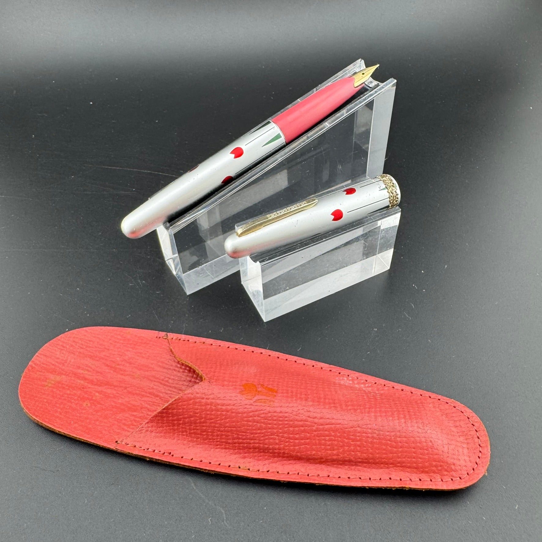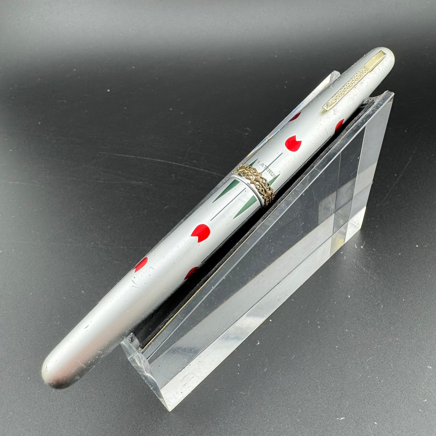 Introduced in 1969, Platinum's Floral Pattern series was the first of its kind. By applying beautiful silk screen printed designs to the barrel and cap, Platinum was able to achieve Maki-e-esque designs at a much more economical price point. There were 9 different designs available. Butterflies, Ginko Leaves, Hibiscus, Hydrangea, Pansies, Passion Flowers, Posies, Shamrocks, Strawberries, and Tulips. This particular pen is the Tulips design.