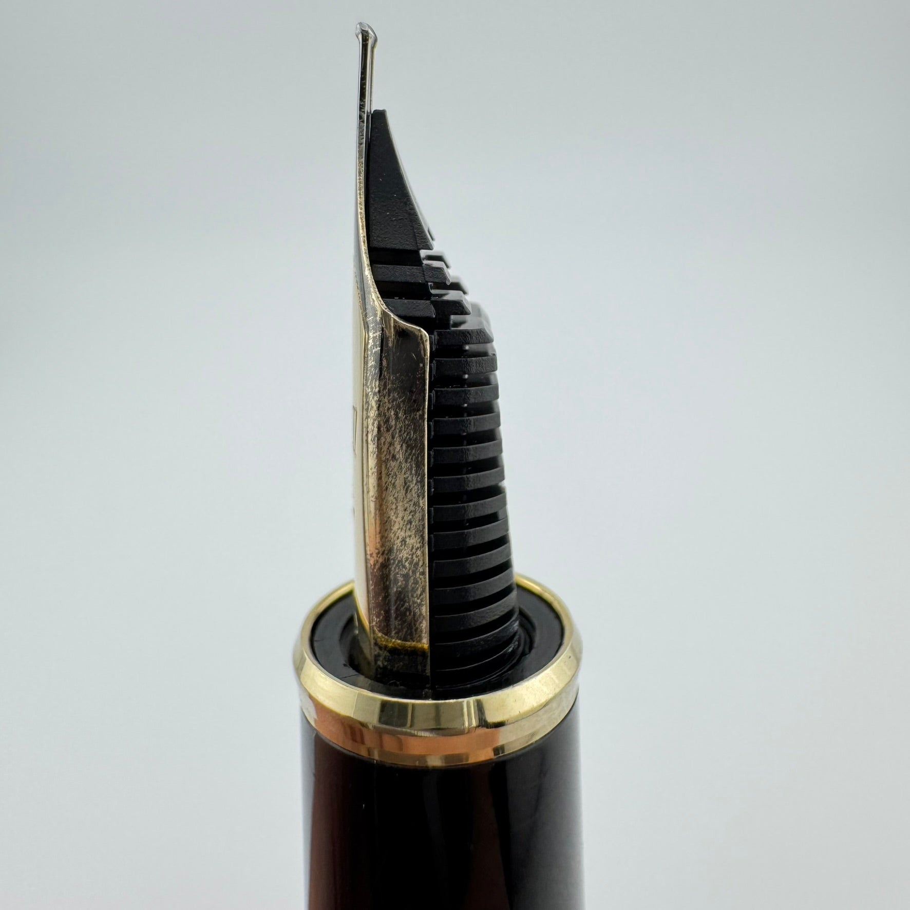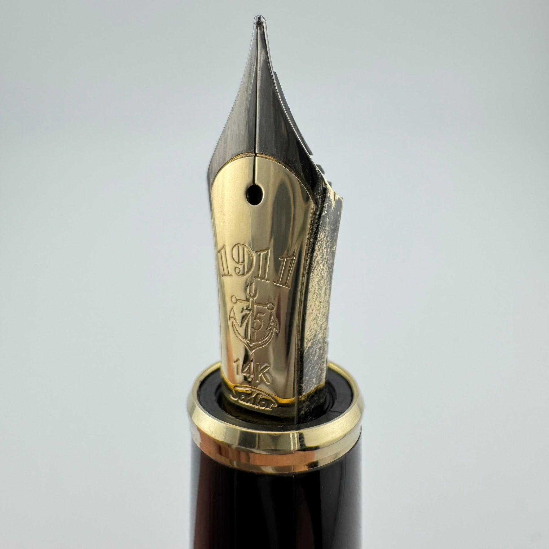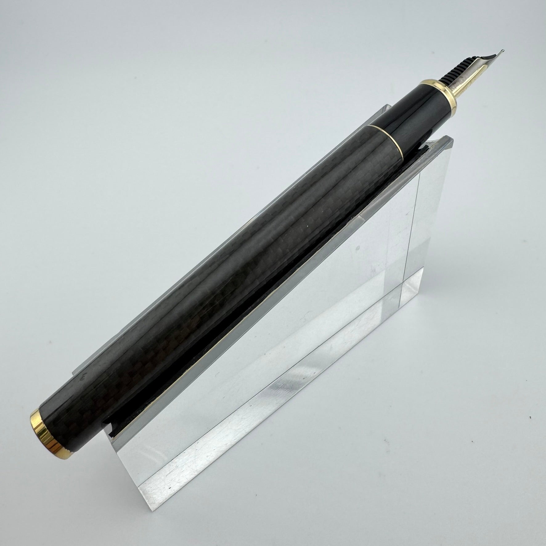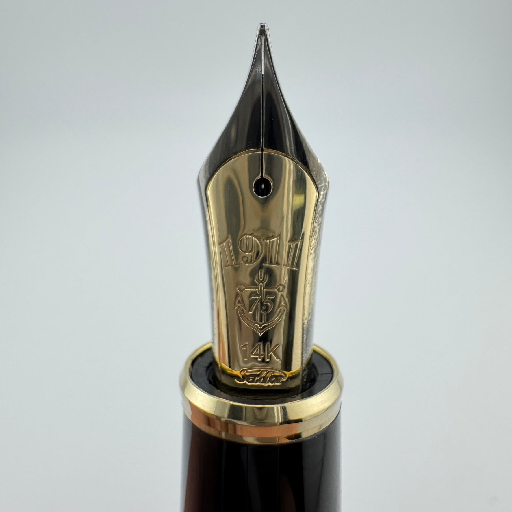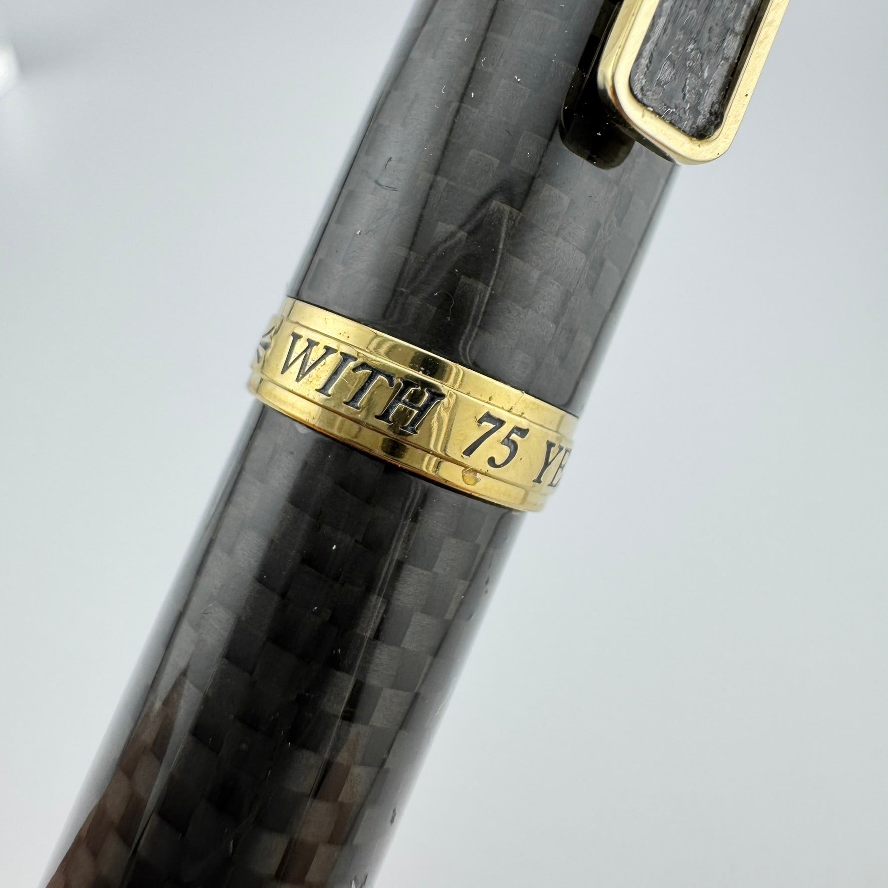 In 1986, the Sailor Pen Company celebrated its 75th Anniversary with this pen, the Profit 75. It features brass and carbon fiber construction and a 14K Gold Two-Tone Sailor nib that uses their black/dark grey plating.