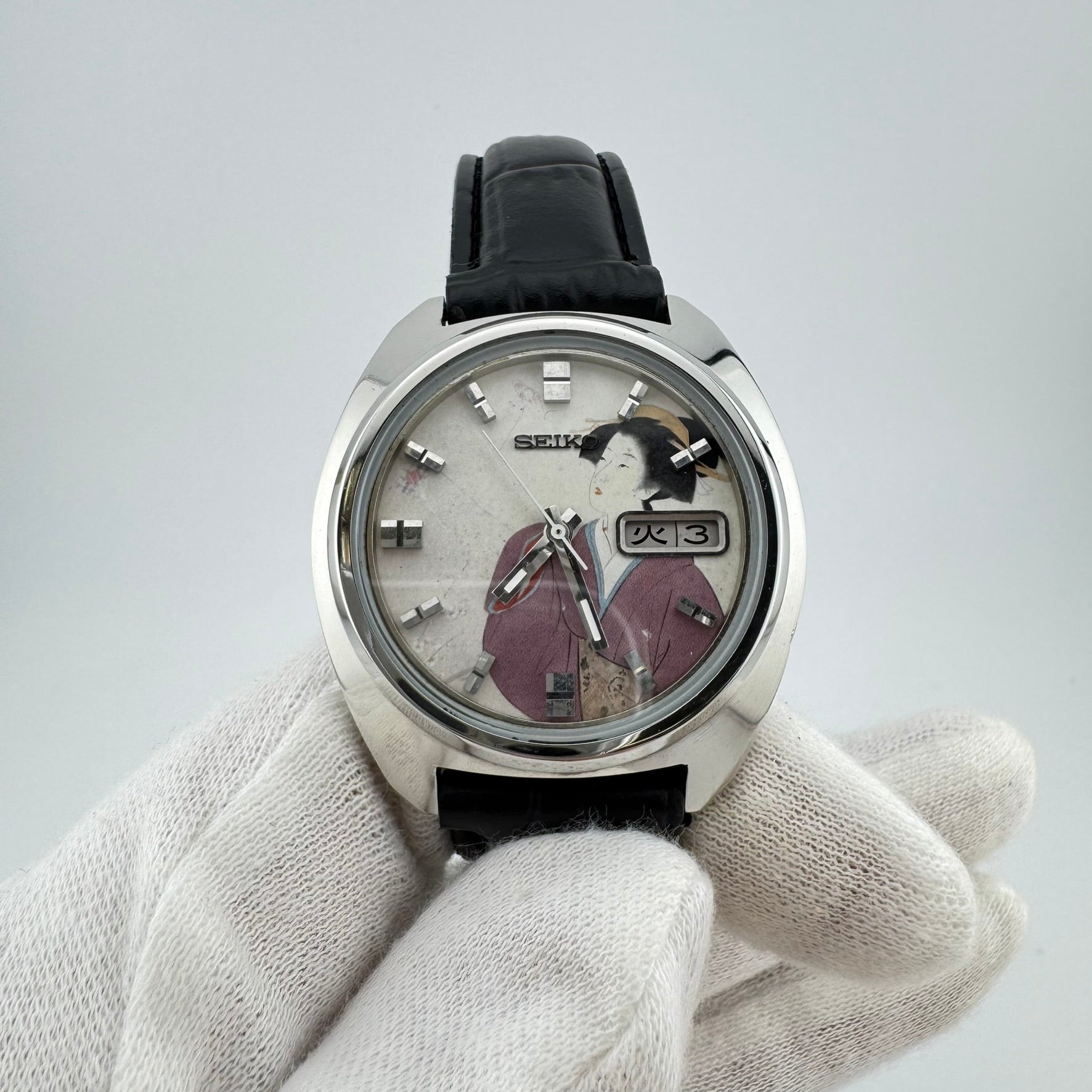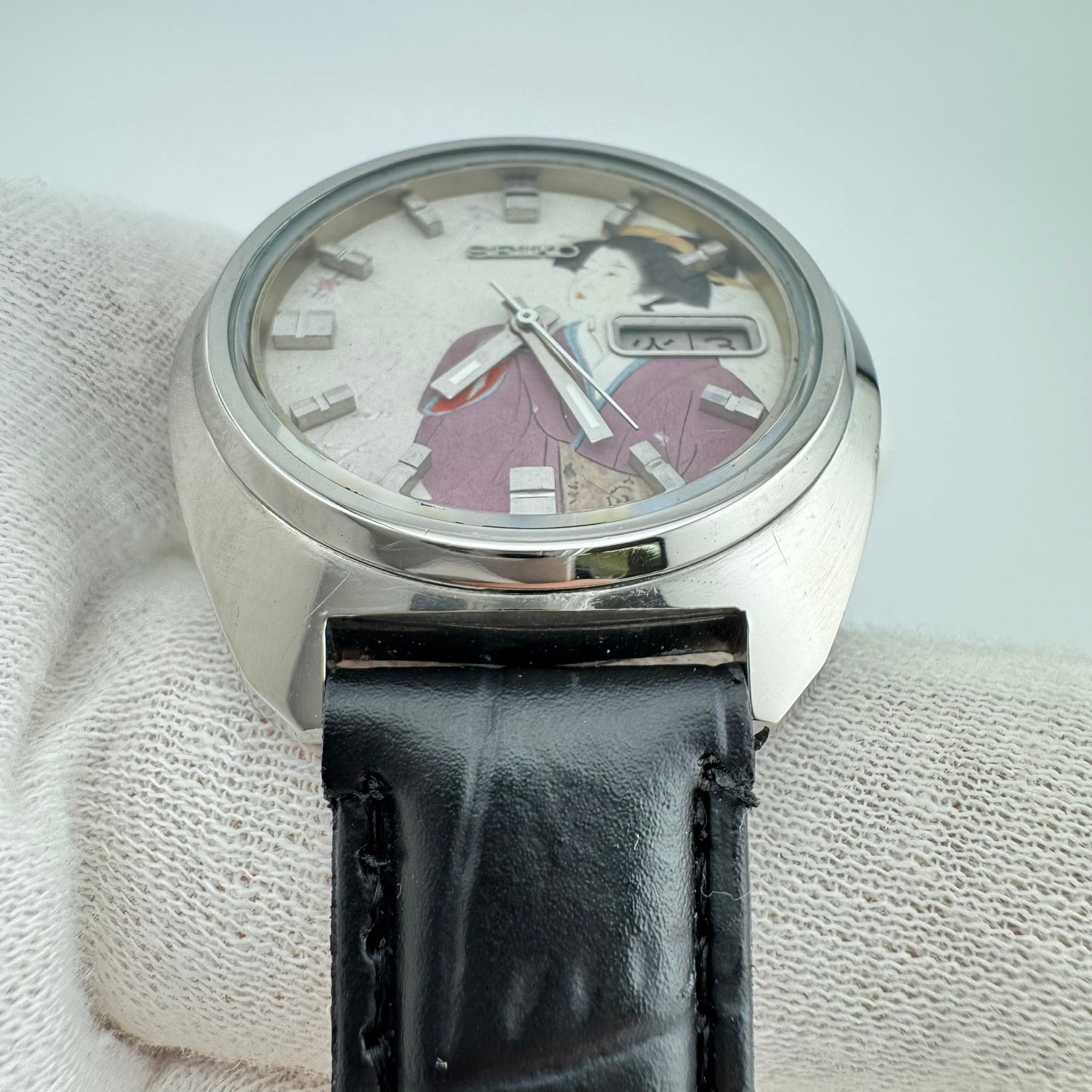 While there is little definitive information available about Seiko watches with Ukiyo-e dials, the practice appears to have begun in the late 1960s and 1970s. Some Seiko retailers were modifying the watches as a form of practice for watchmakers. The dial was modified with all applied text, indices, and hands removed. A Ukiyo-e image from a stamps was then applied to the dial and the applied text, indices, and hands were replaced. The result was a striking Seiko dial while also teaching a skill to watchmakers.