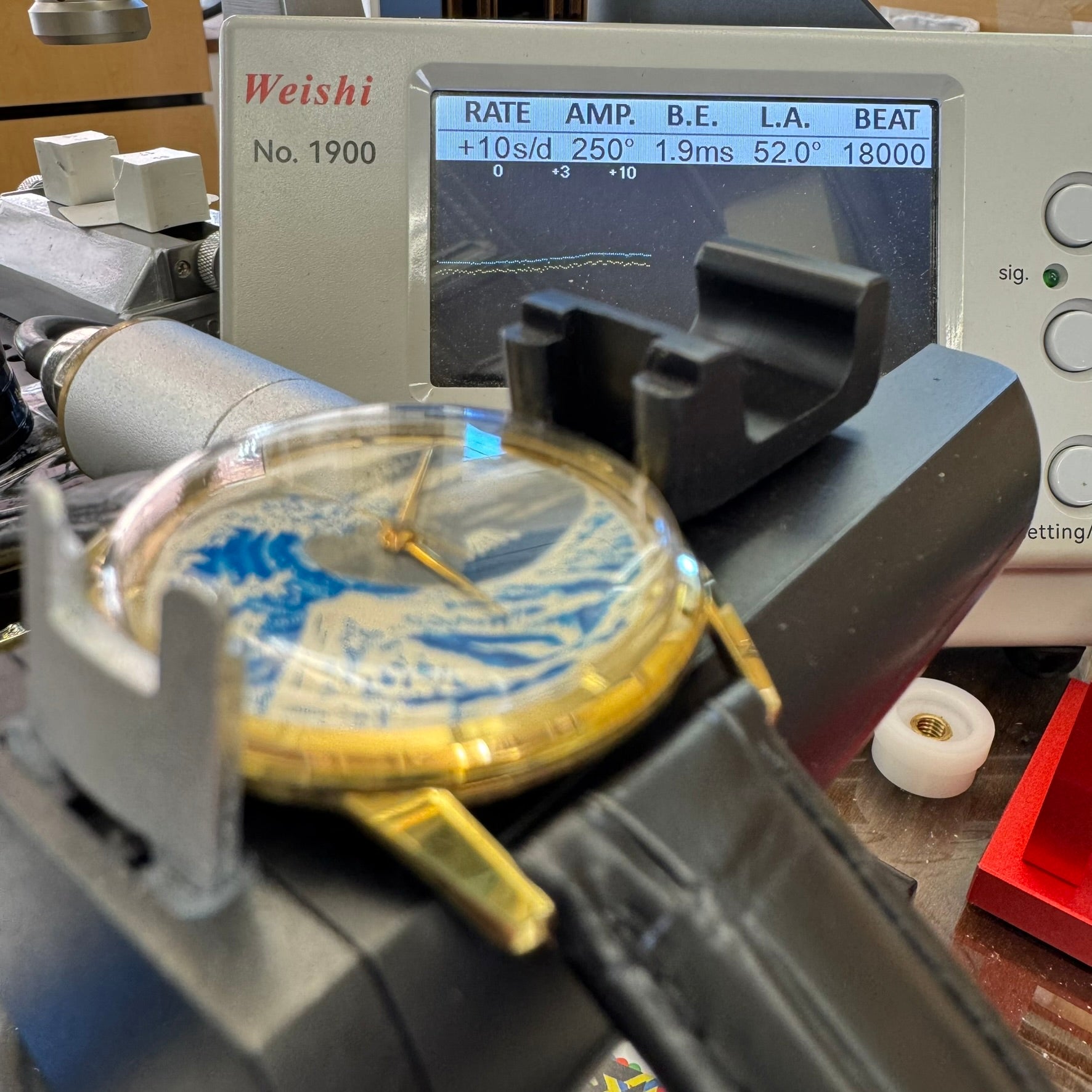 The Ace was Citizen's mid-grade mechanical dress watch introduced in 1961. It features a Citizen 9200 series movement which was a slightly less regulated version of the movements found in the 1958 version of the Citizen Deluxe. This particular Ace features a gold plated case and a beautiful dial depicting Hokusai's The Great Wave off Kanagawa