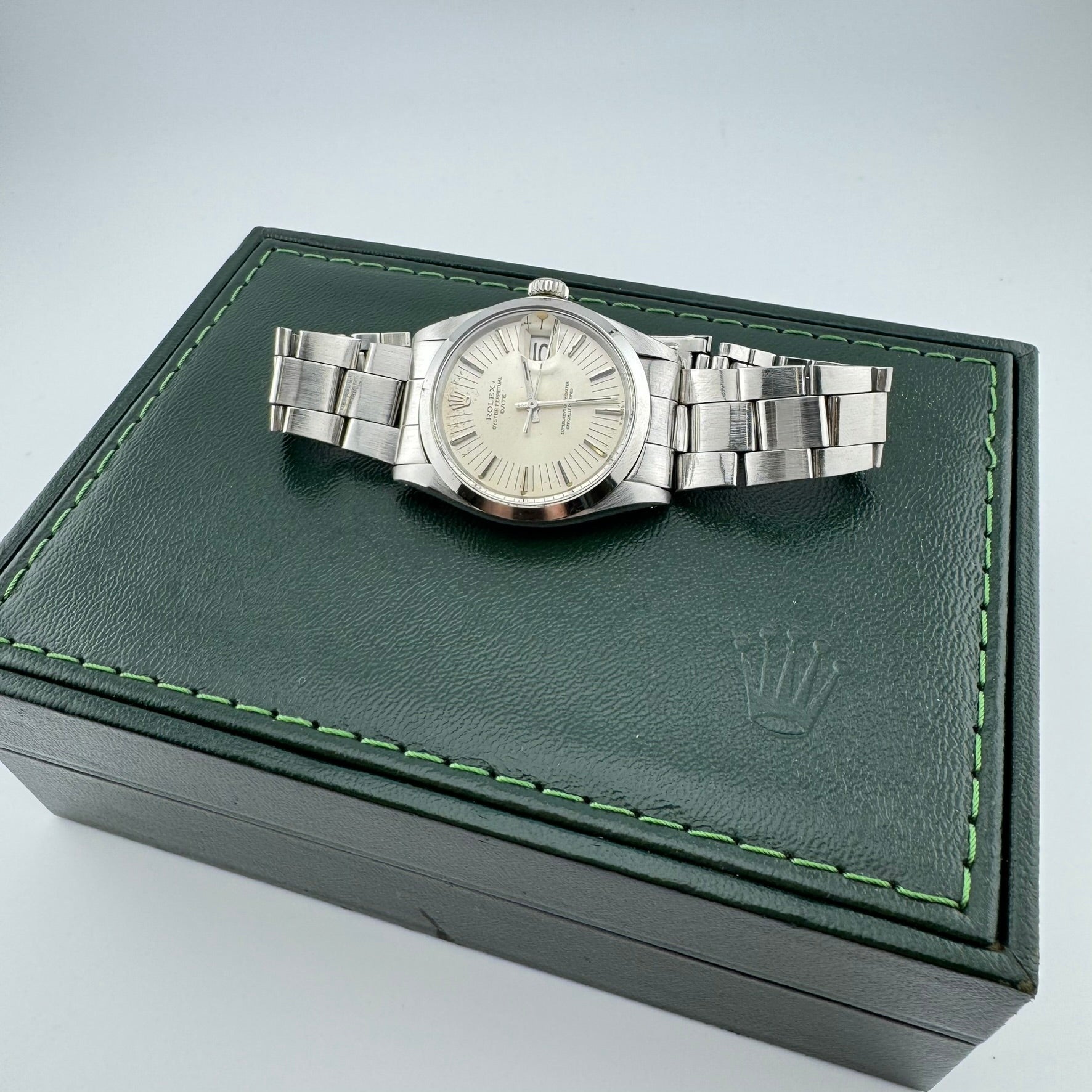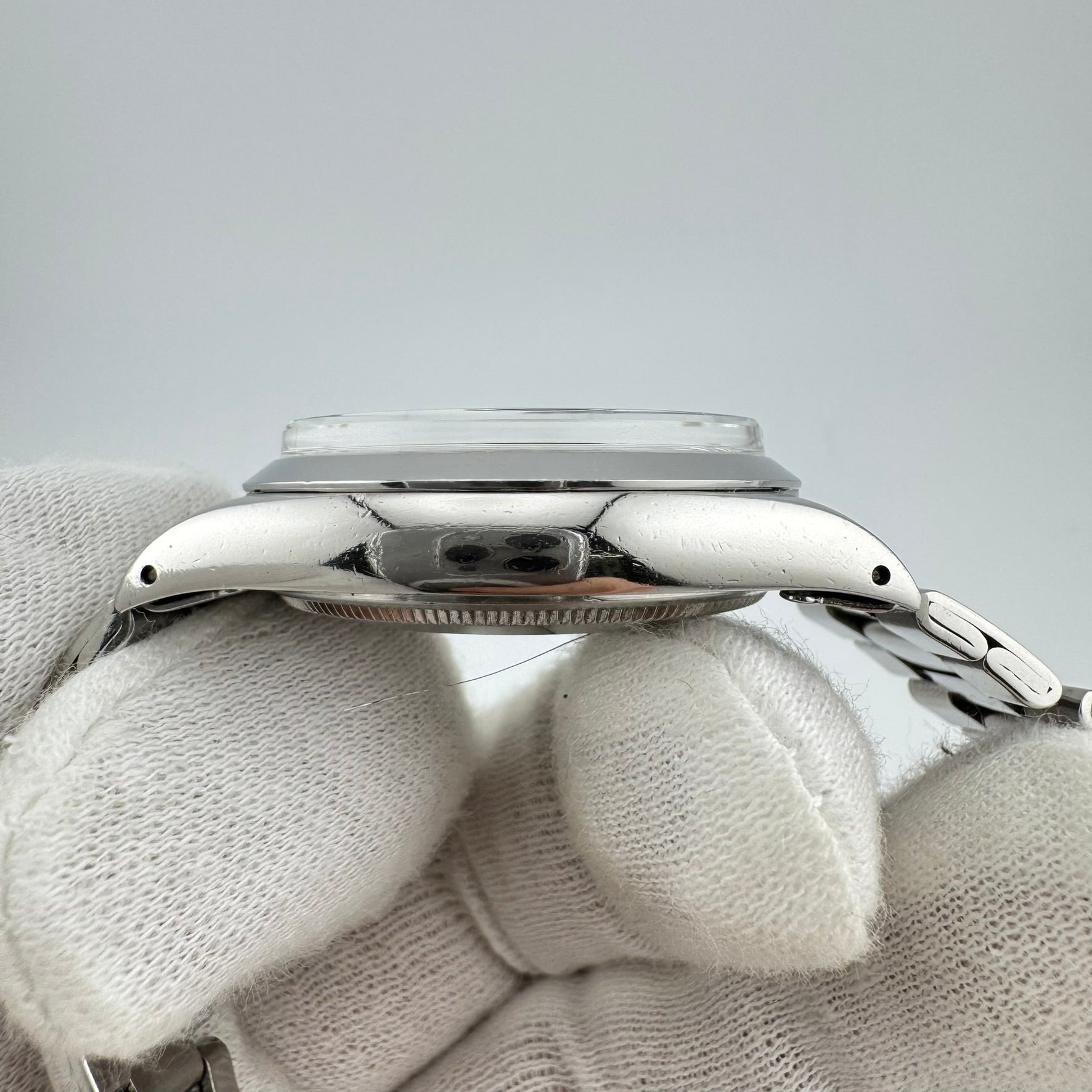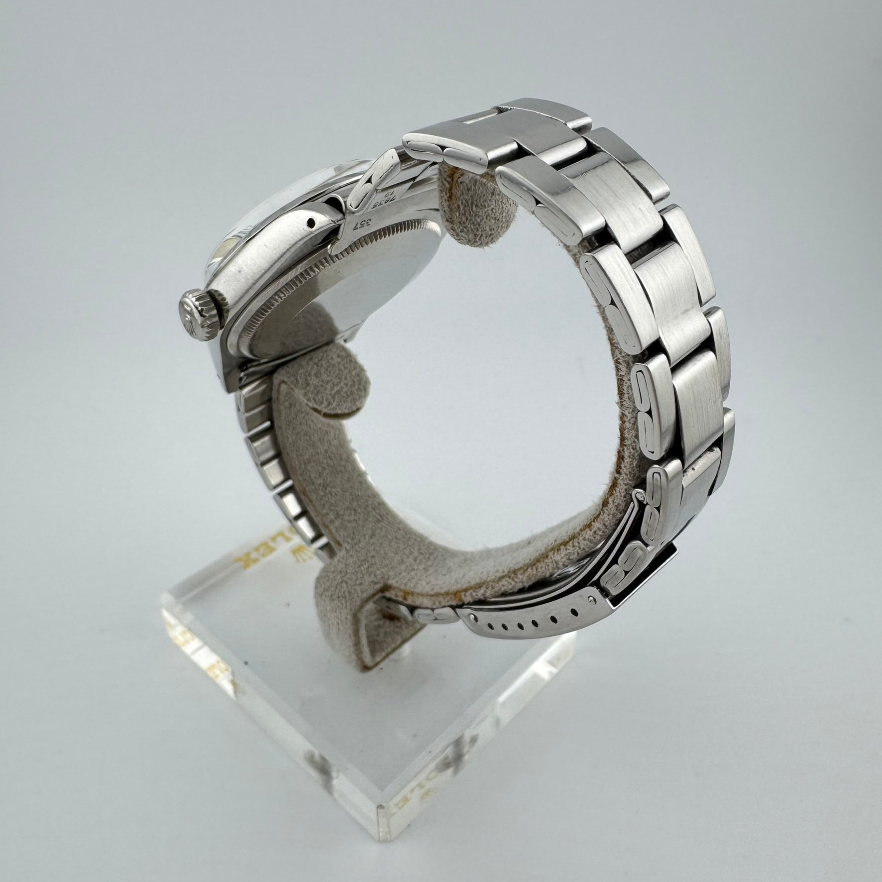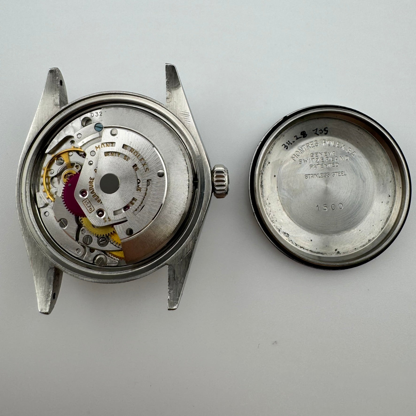 This watch is the Oyster Perpetual 1500 reference. The watch has had the original crystal replaced with a new aftermarket acrylic crystal. All of the original gaskets have been replaced, and the watch has been pressure tested to 5bar to ensure waterproofness.