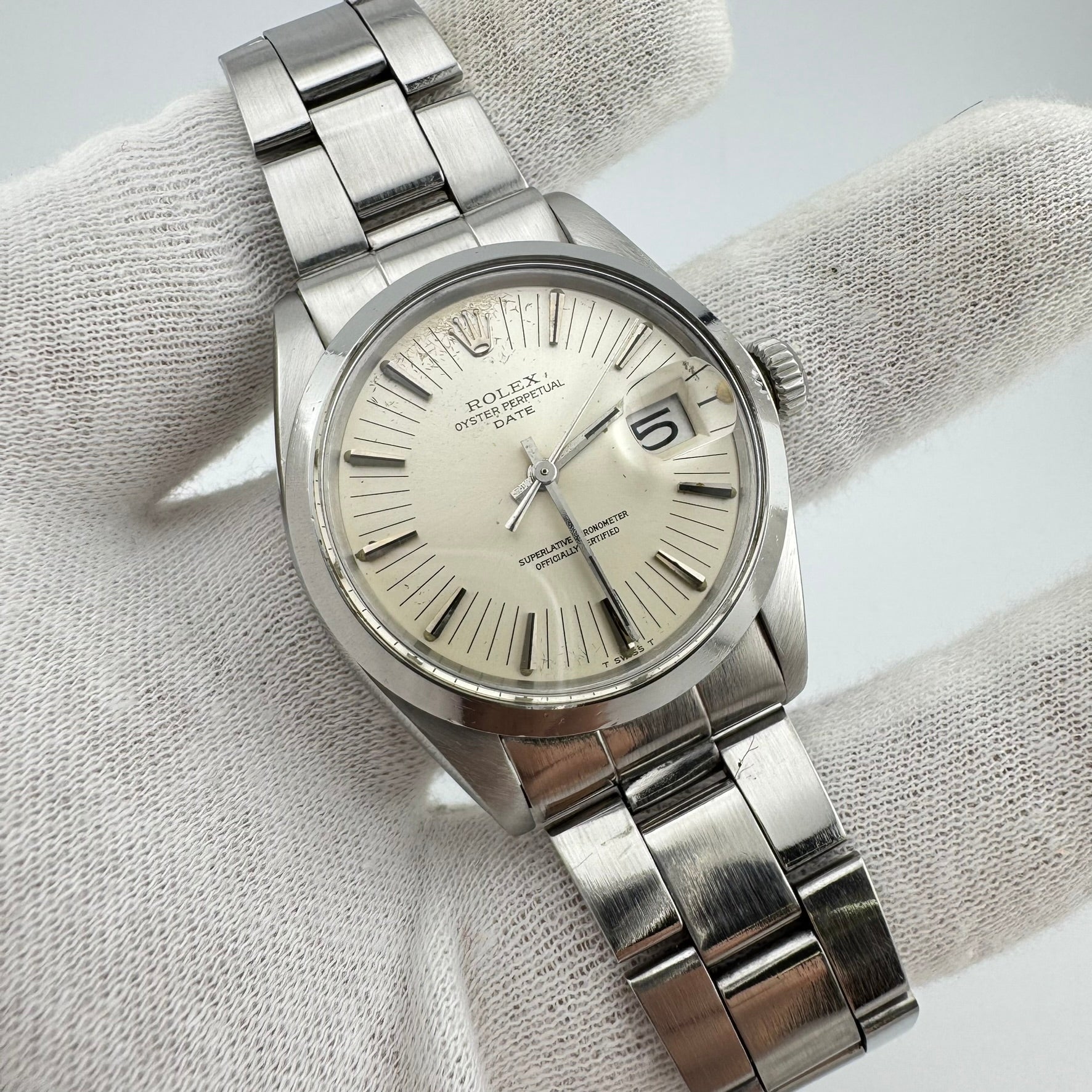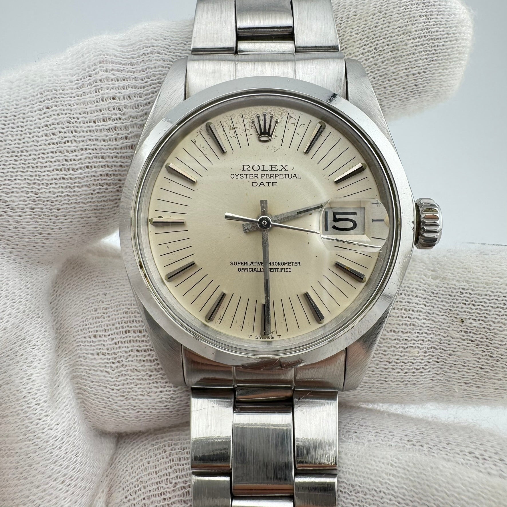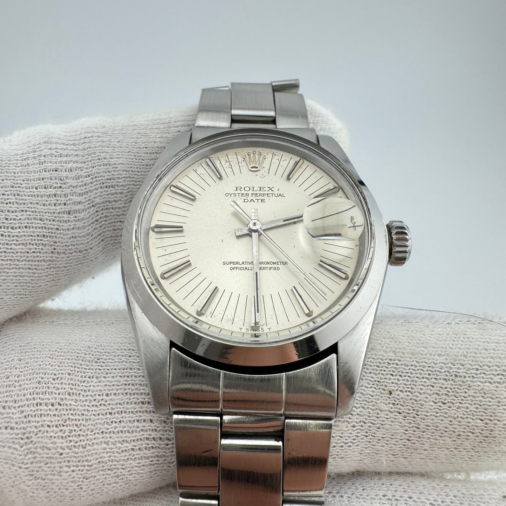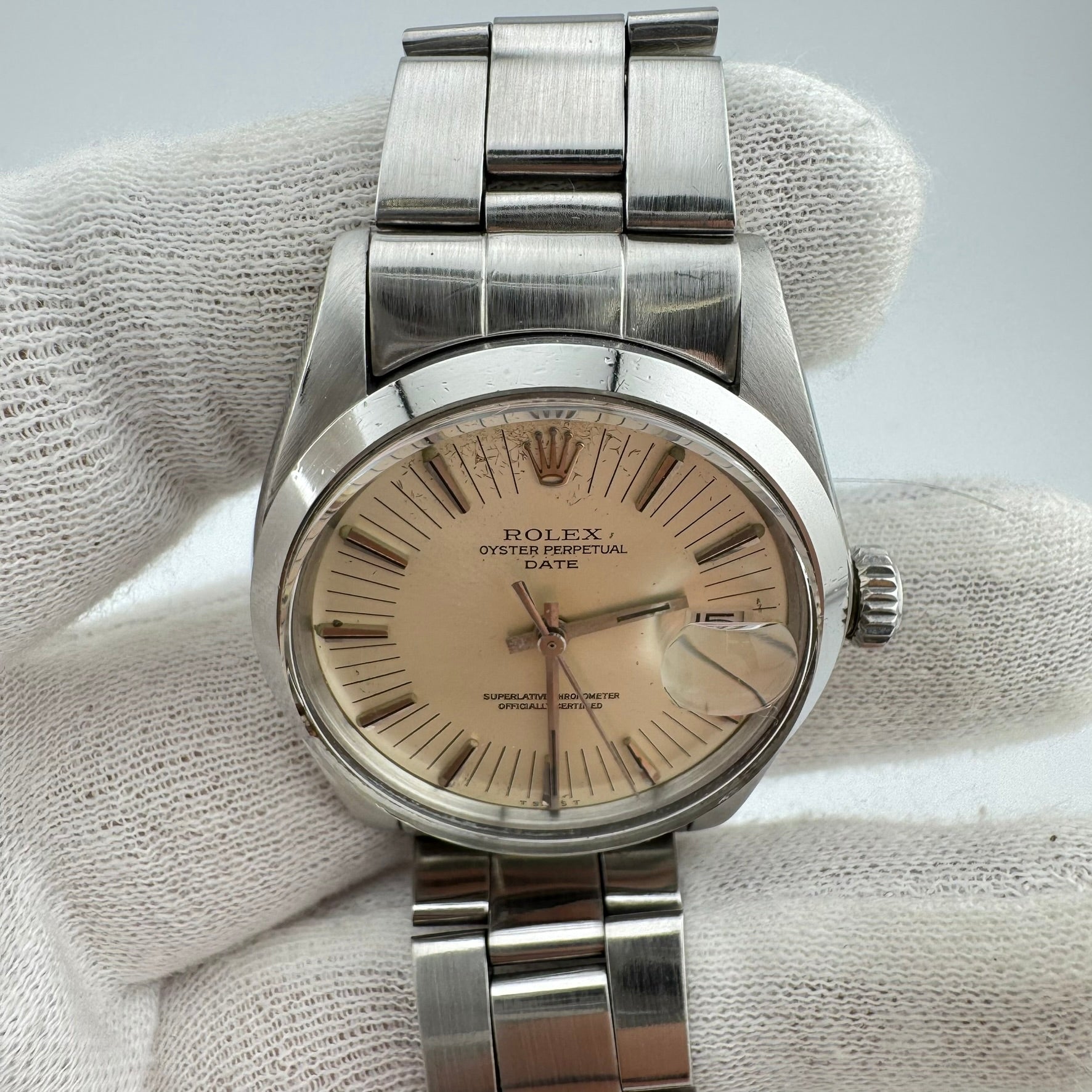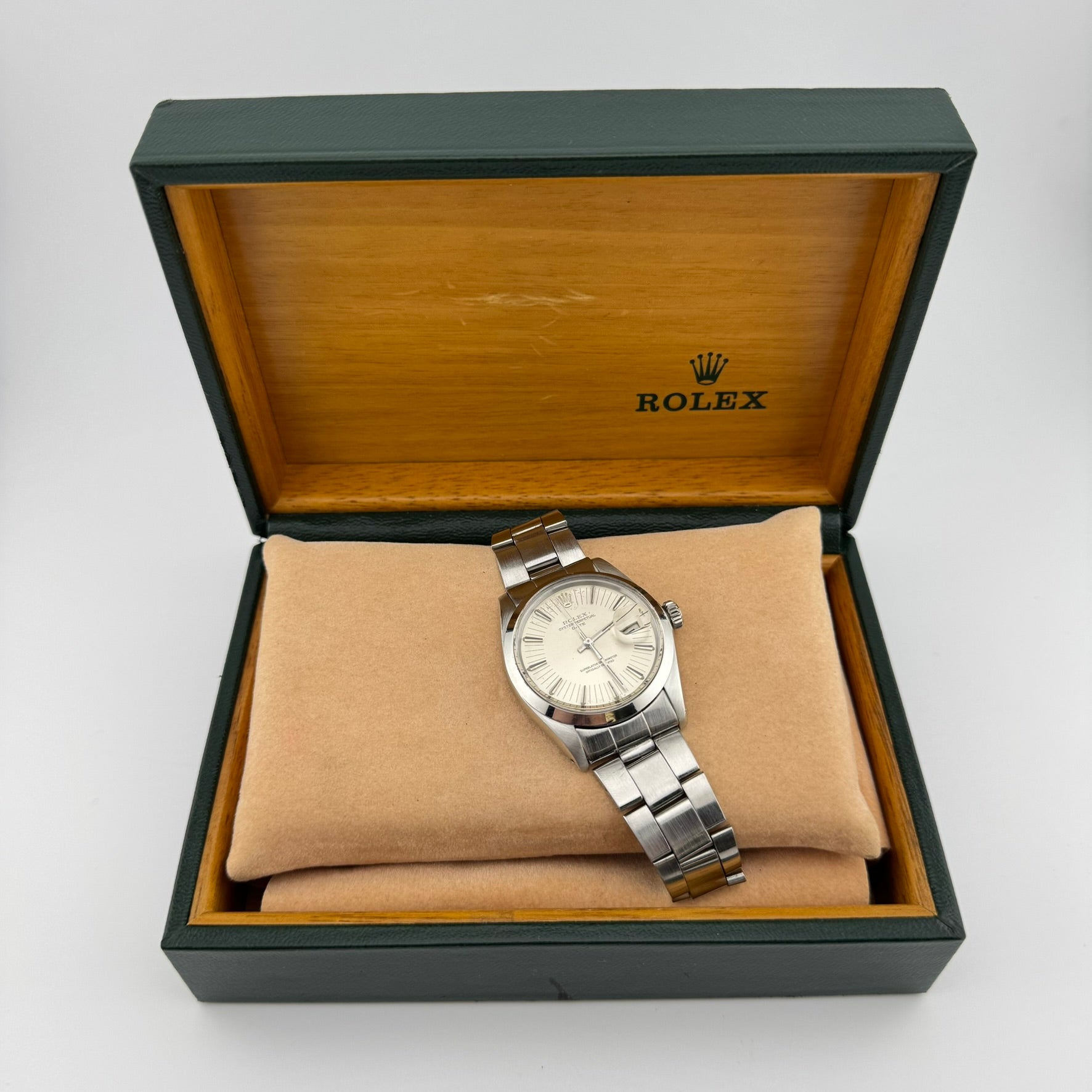 This watch is the Oyster Perpetual 1500 reference. The watch has had the original crystal replaced with a new aftermarket acrylic crystal. All of the original gaskets have been replaced, and the watch has been pressure tested to 5bar to ensure waterproofness.