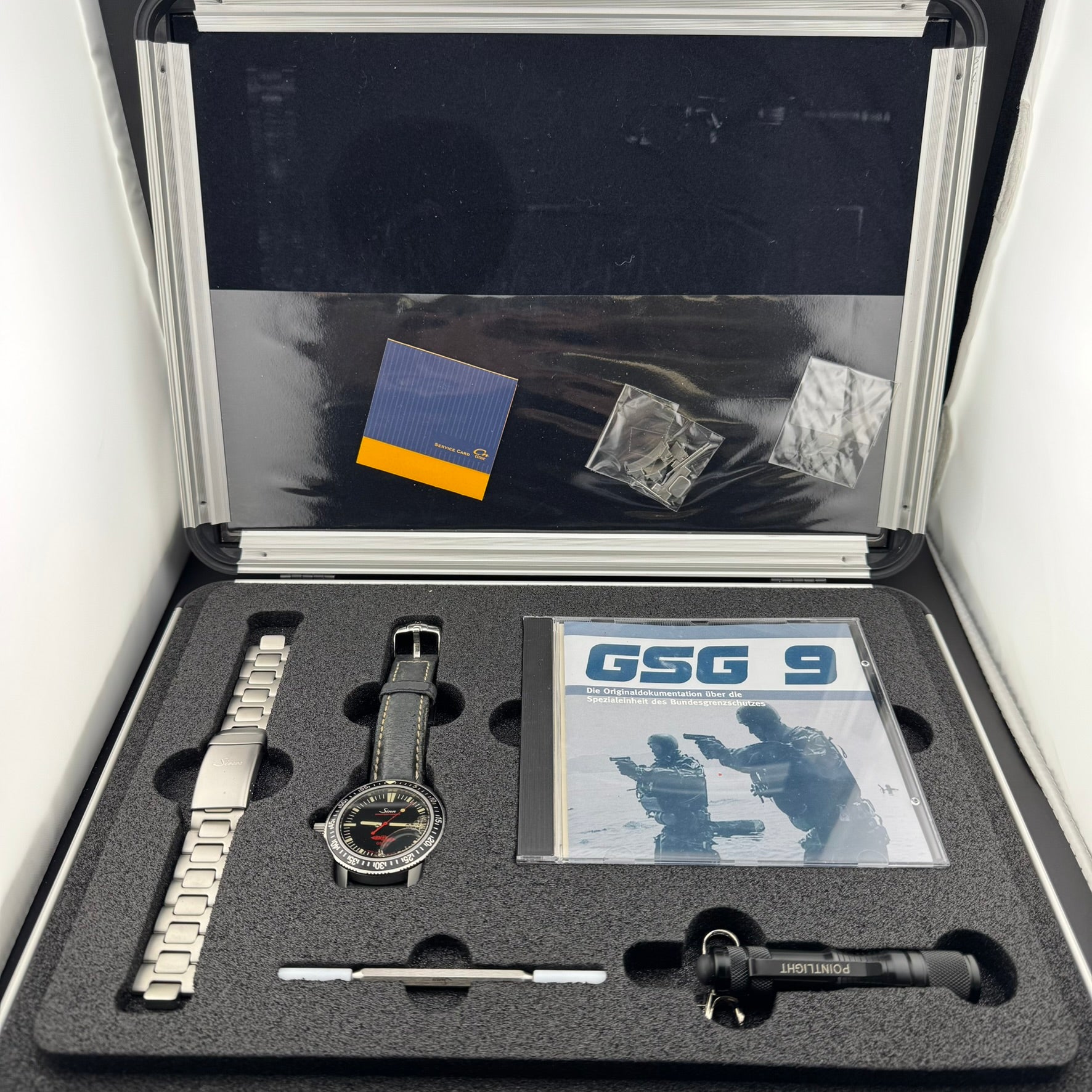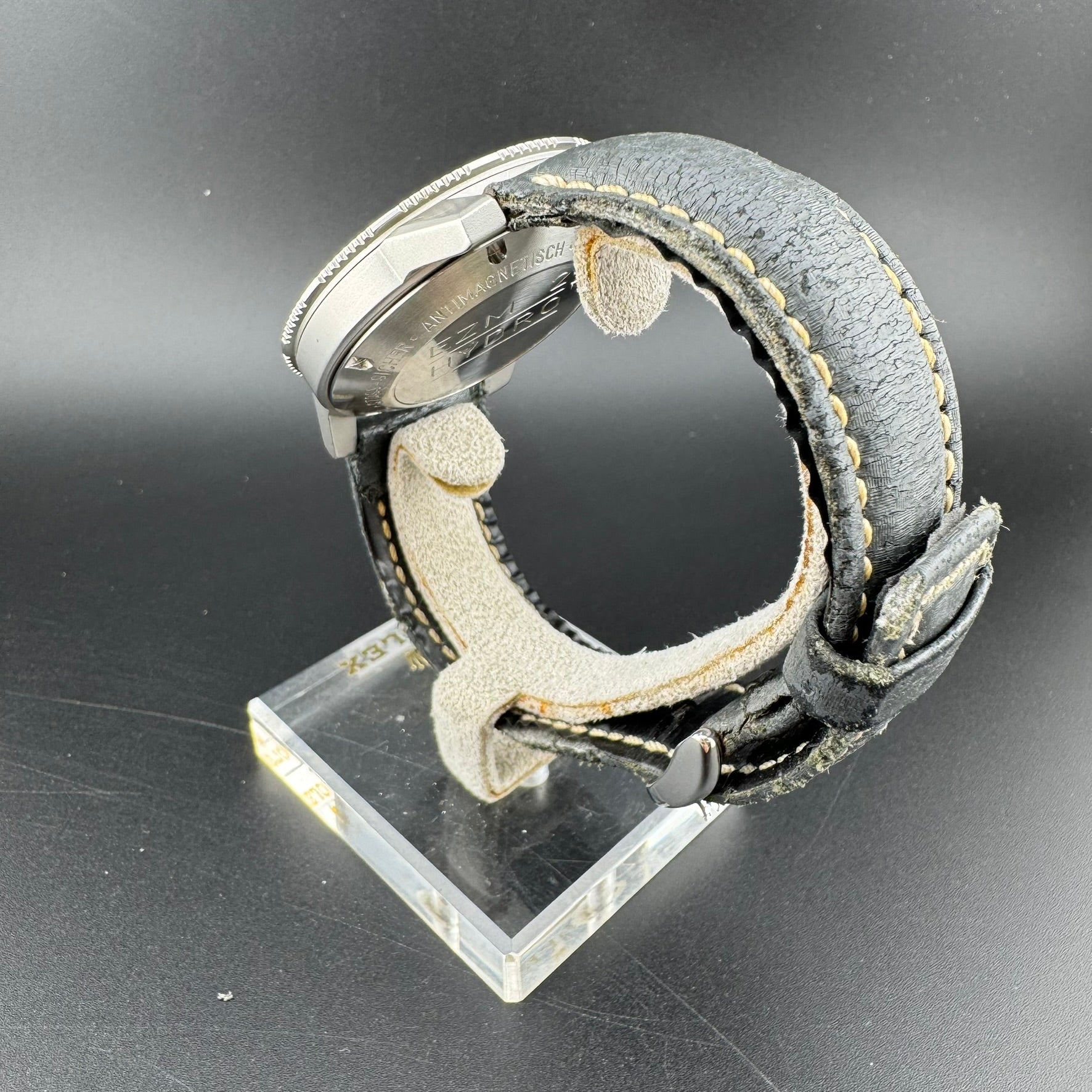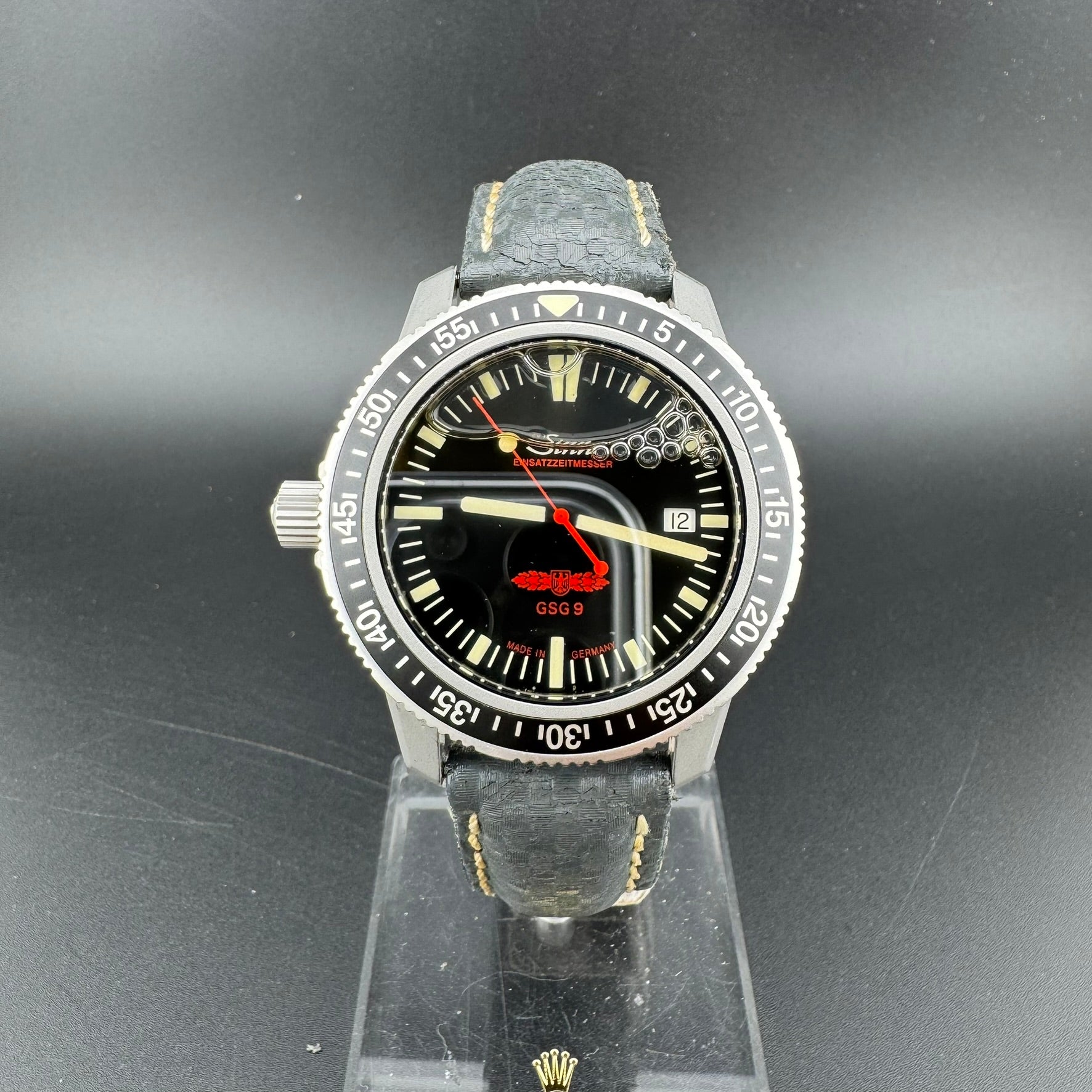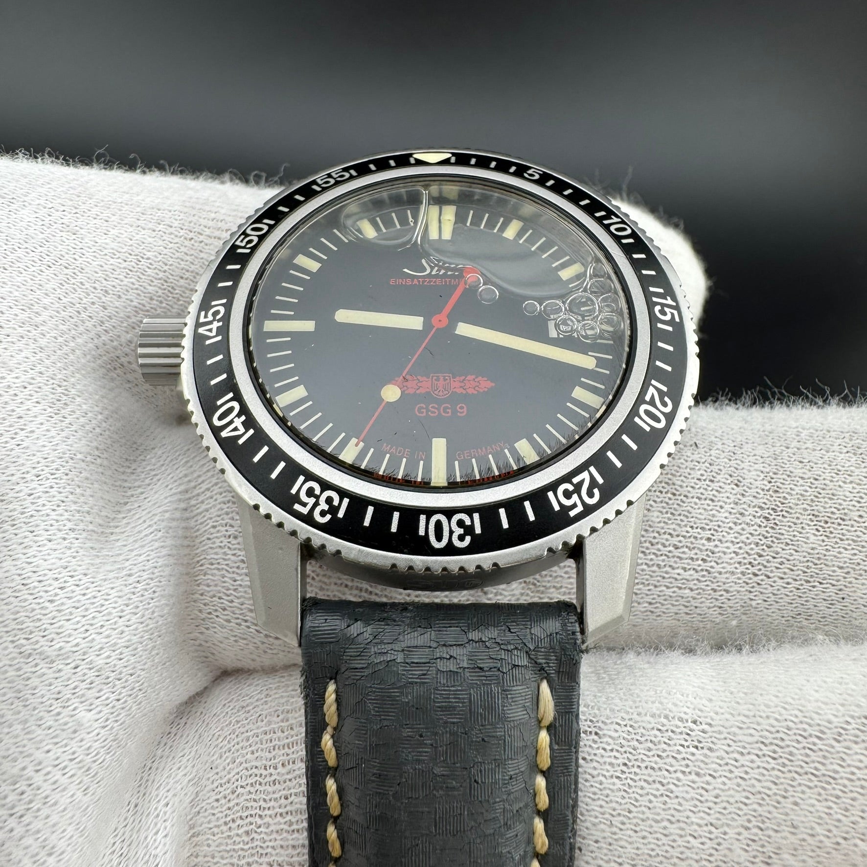 The cosmetic and mechanical condition of this watch is good, but the watch should be sent in to a Sinn service center to have the silicone oil refilled if there is intent for diving, as there are some air bubbles due to lack of oil.
