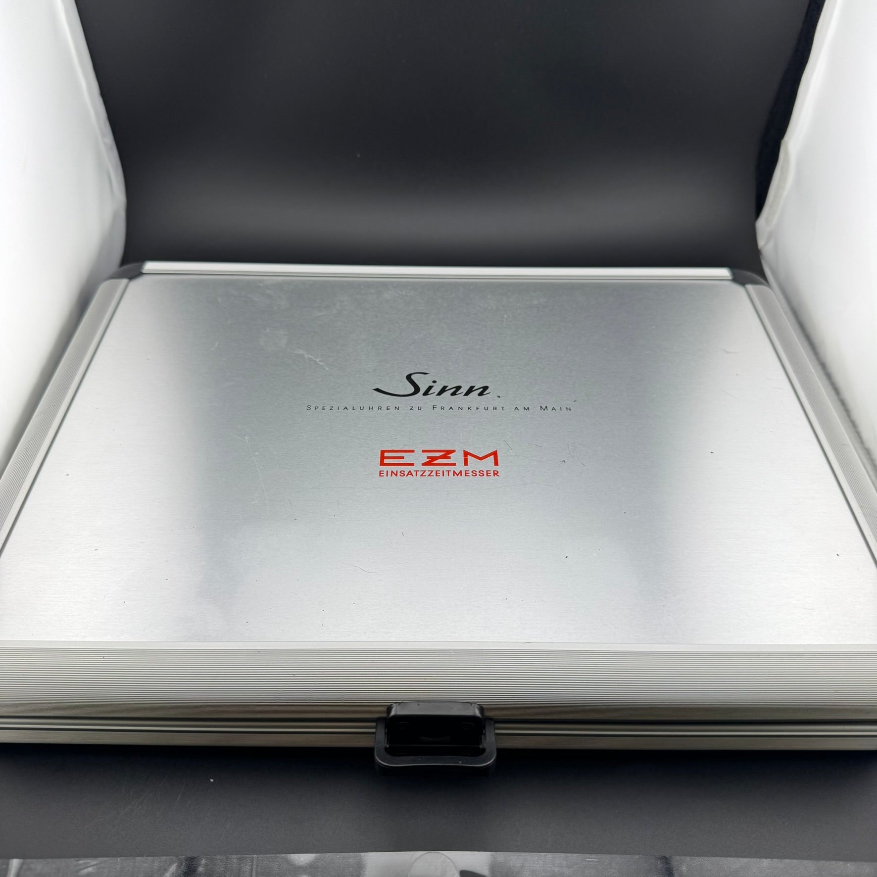 Pre-owned Sinn model 403 EZM (Einsatzzeitmesser) 2 Hydro watch complete with box and accessories. The Sinn EZM features a sealed case filled with silicone oil. The oil is incompressible, and has the same reflectivity index as sapphire glass. This allows for near perfect visibility in a wide array of conditions and viewing angle. And due to the incompressible nature of the oil, the watch has a water resistance rating of 5000 meters.