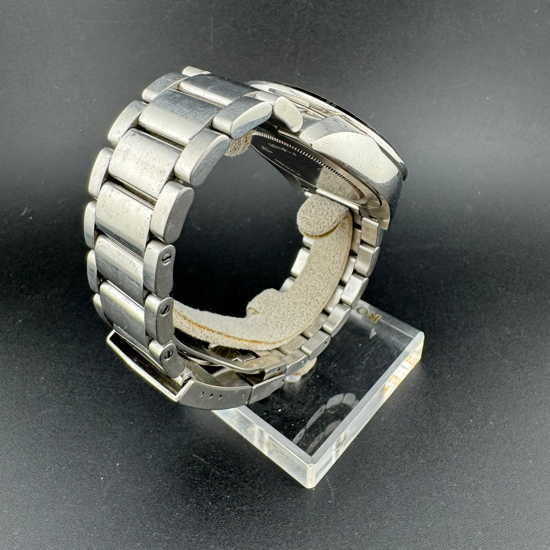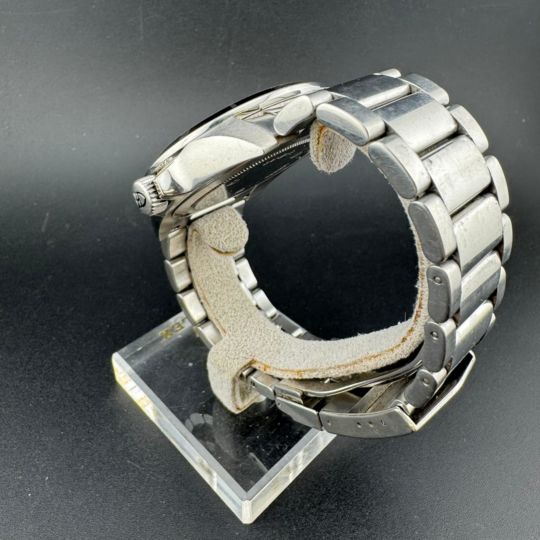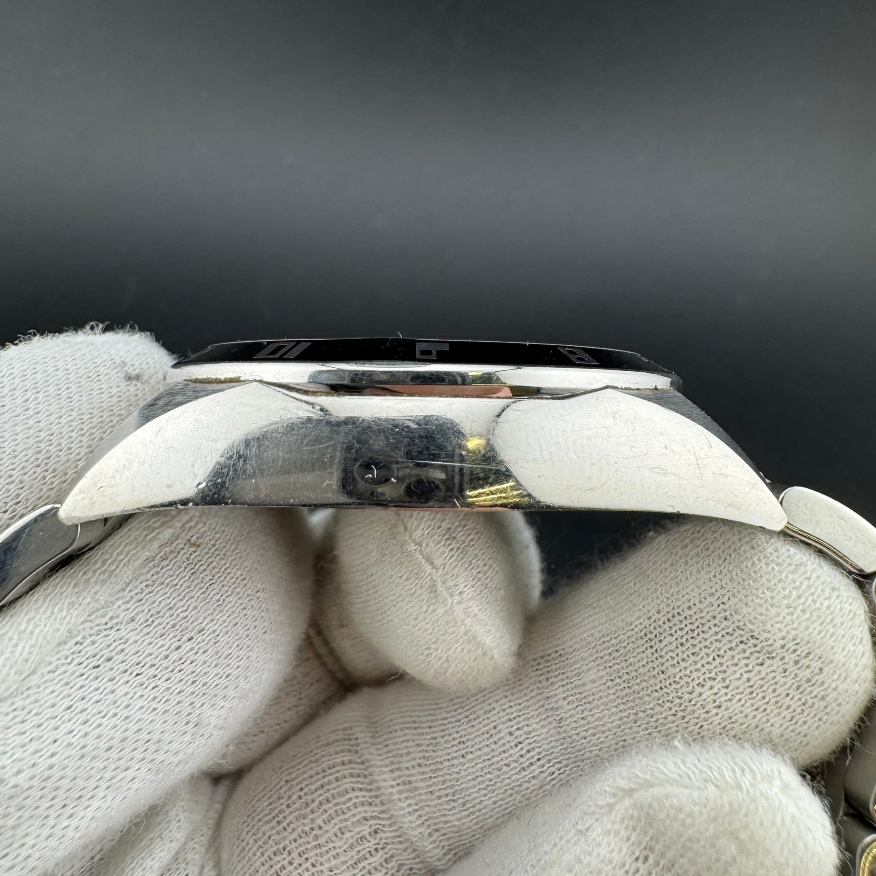 -C: Item is in Fair condition. Heavy scratches and scuffs can be seen on sides of the case, bezel, and bracelet. Significant pitting or gouges are visible on the sides of the case and the crystal shows multiple deep scratches