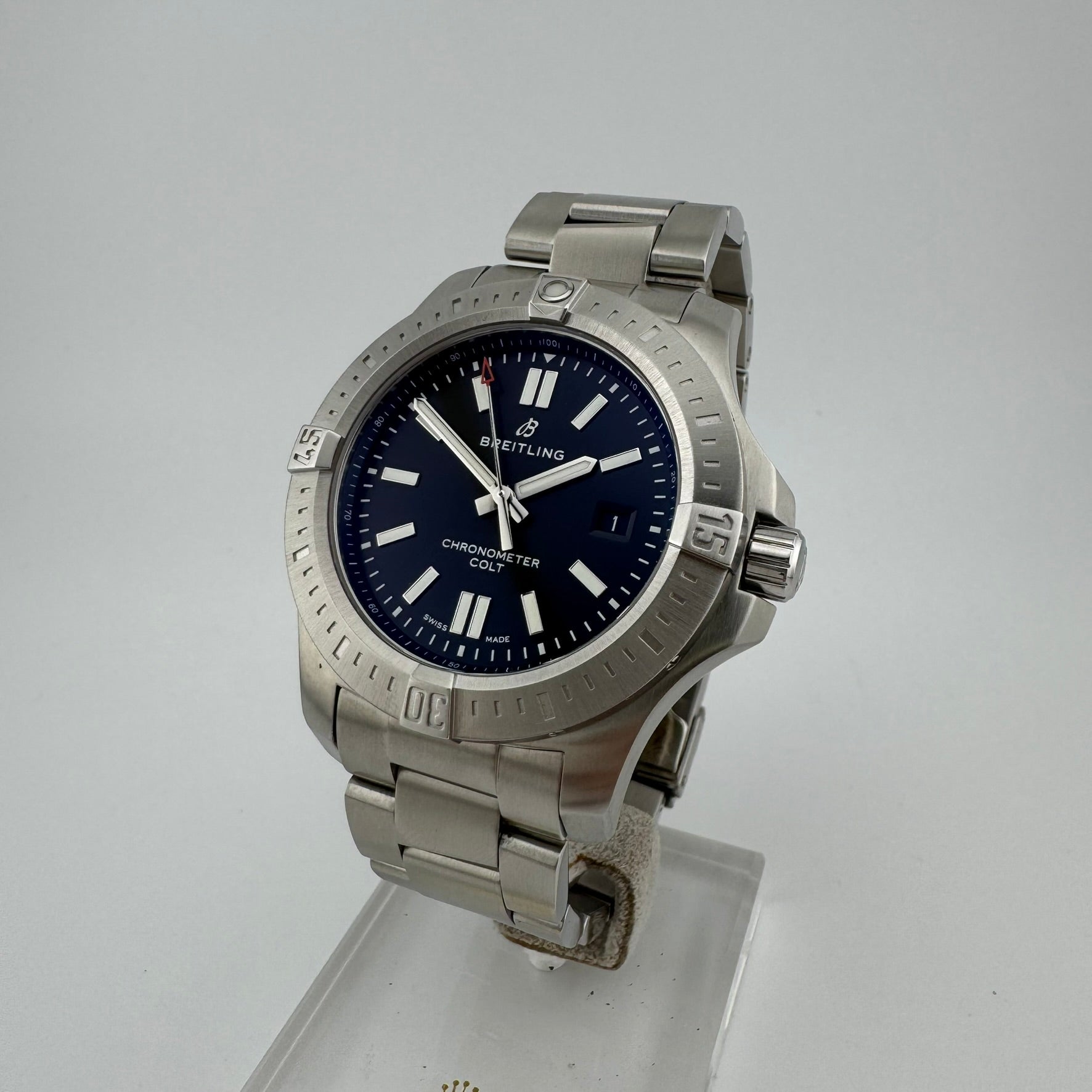 Pre-owned Breitling Colt Automatic 44 Chronometer Watch. Reference A17388. Overall, this watch is in A+, Excellent condition. Watch shows little signs of wear and comes with all original paperwork and warranty card.