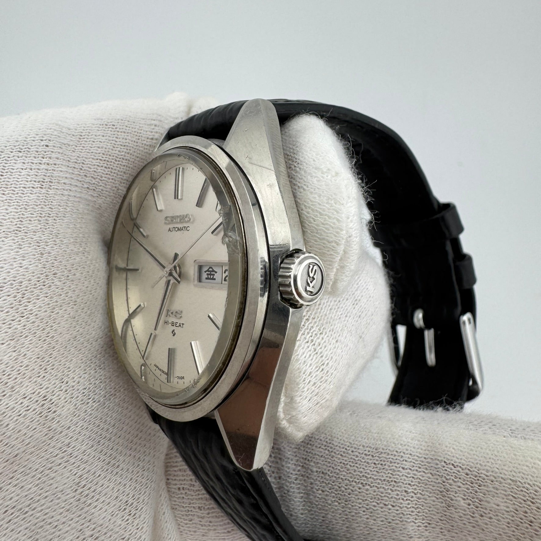 The 56KS series was the only King Seiko line to be produce by Suwa Seikosha rather than Daini Seikosha. Suwa Seikosha and Daini Seikosha were the two segments of Seiko competing against each other in the high-end watch segment. Suwa Seikosha developed and produced Grand Seiko while Daini Seikosha developed and produced King Seiko. The 56KS watches are the only King Seikos to be produced by the Grand Seiko factory. Notice the Suwa typhoon symbol on the dial just below the words "hi-beat." This differs from the thunderbolt symbol that denotes Daini production.