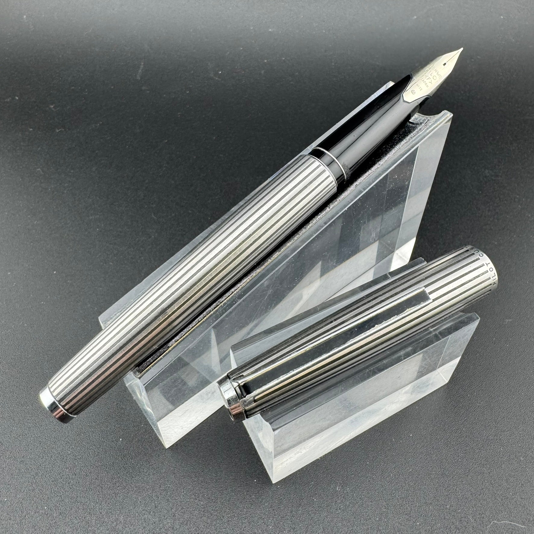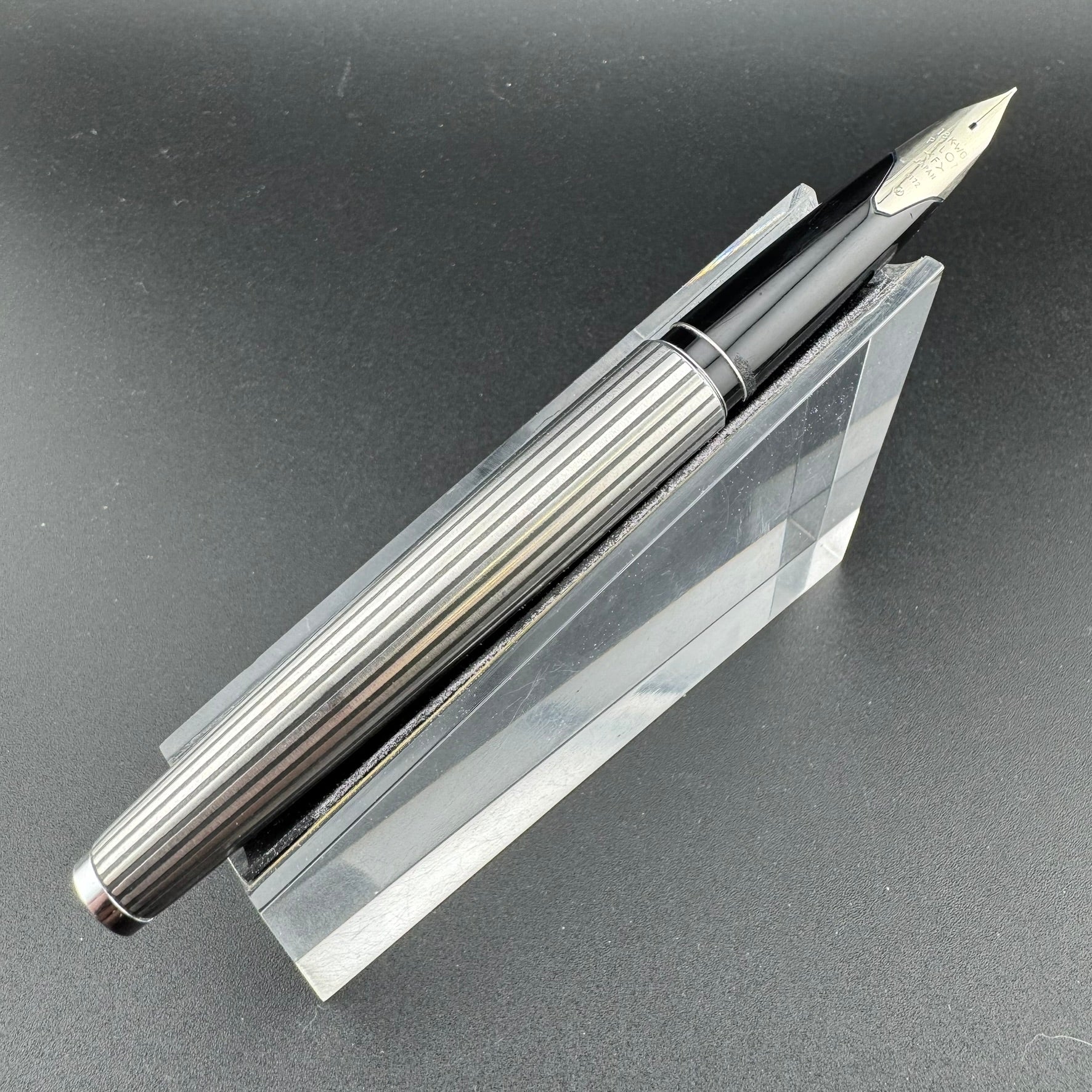 The Pilot Custom K series of pens, released in 1971, consists of three pens, each created to look different but with the same intent. The pens can be found as a stainless steel pen with black chrome stripes running along its body down to the nib (K-500SS), a sterling silver pen with a checkered body (K-1000SS), and a pen created with gorgeous wood from painted maple trees (K-700KS). These different styles of pens were created to give a sense of individuality to each person who bought one, and they continue to live up to their duty today. The Custom series grew to be one of the most popular Pilot fountain pens and has been produced in a variety of styles and finishes. It is these three pens that started the line. The black resin K-500RS was introduced to the market in 1972.