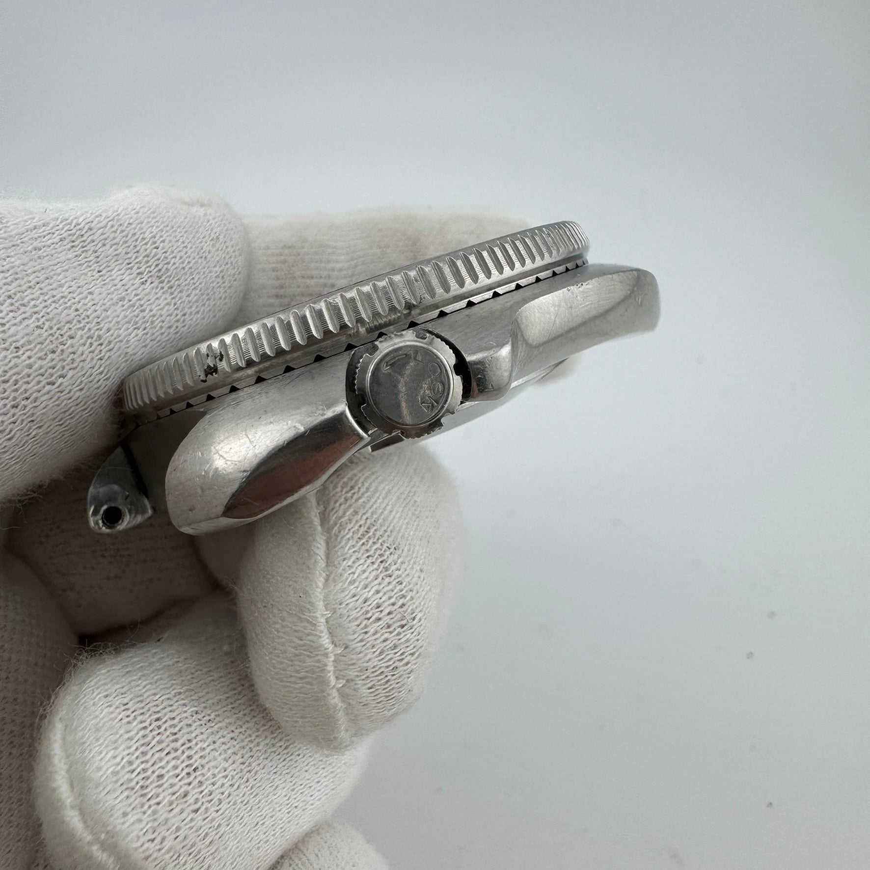 -C: Item is in Fair condition. Heavy scratches and scuffs can be seen on sides of the case, bezel, and bracelet. Significant pitting or gouges are visible on the sides of the case and the crystal shows multiple deep scratches