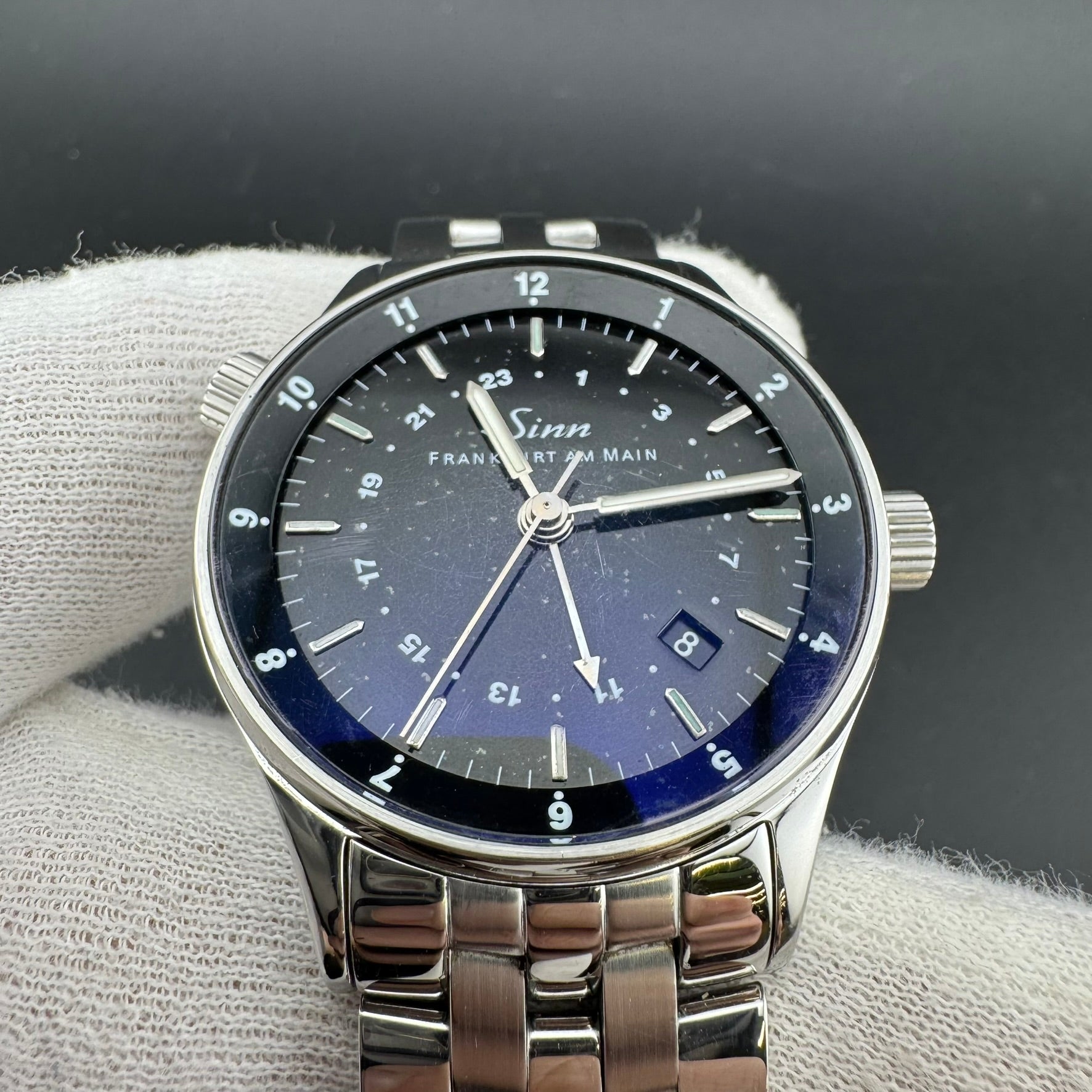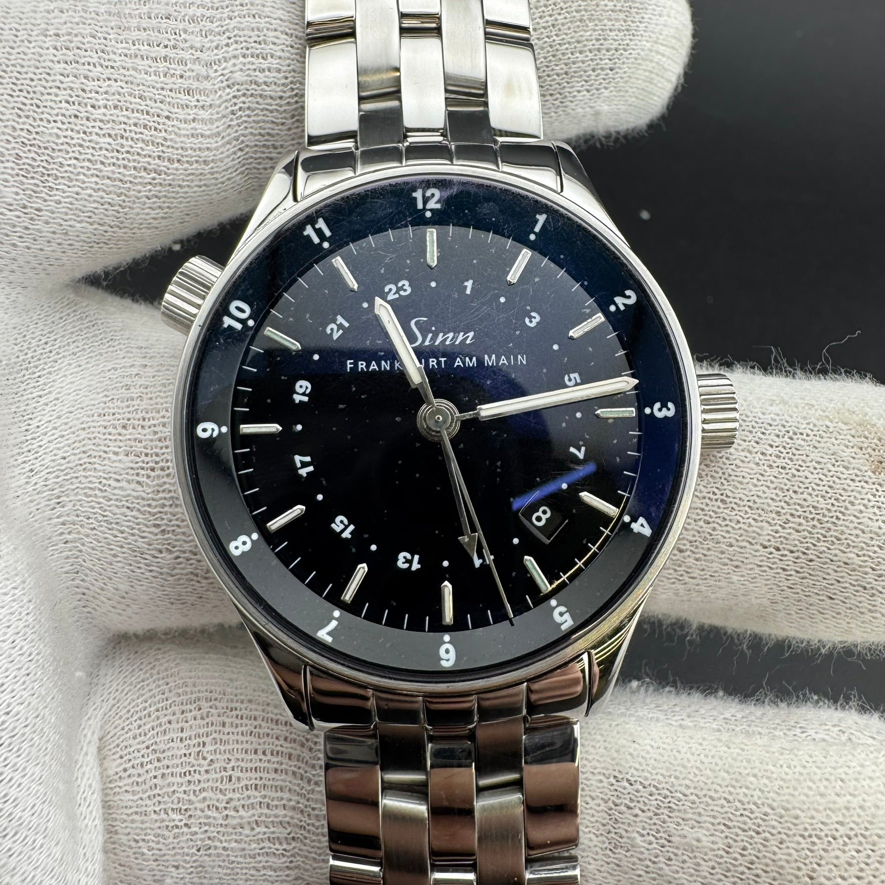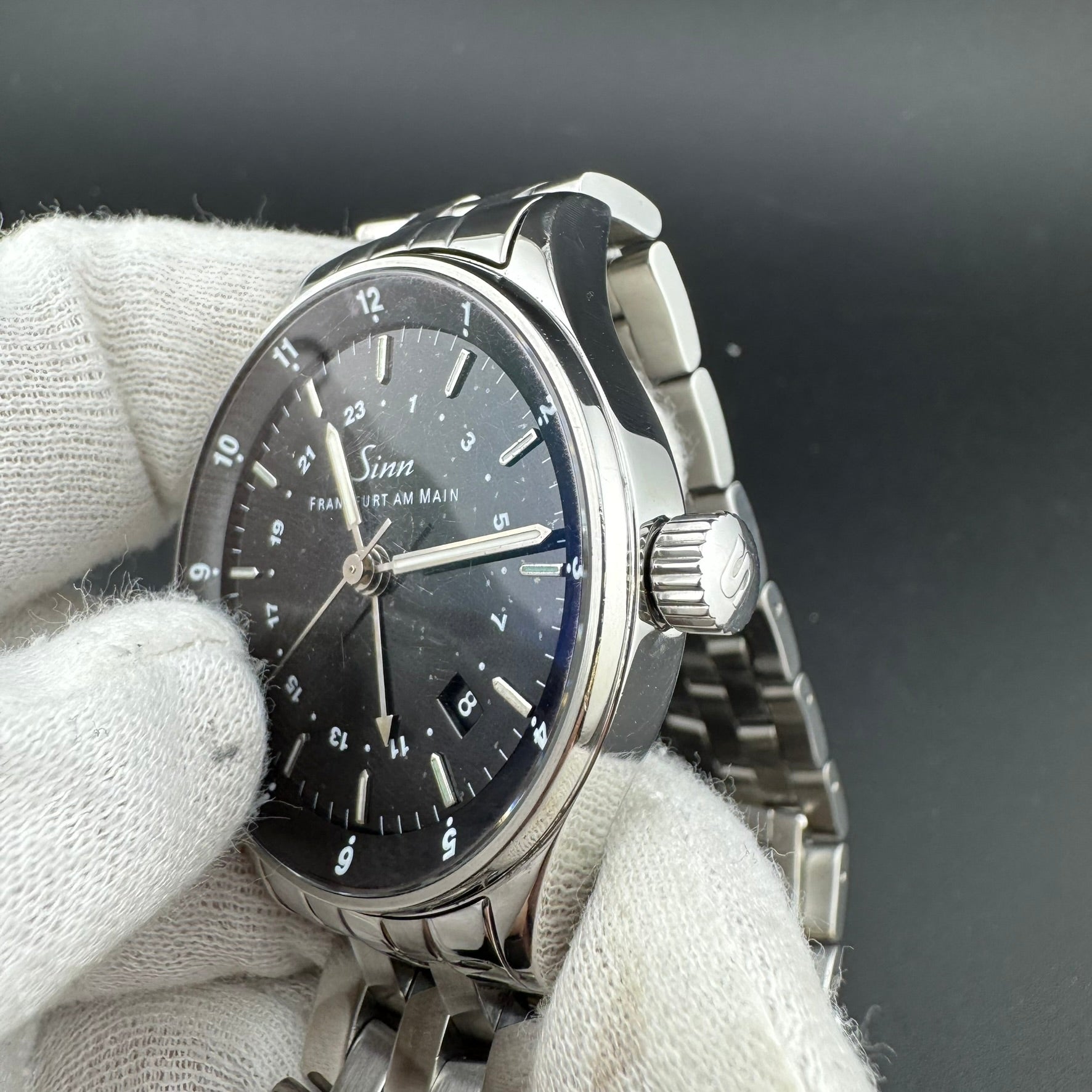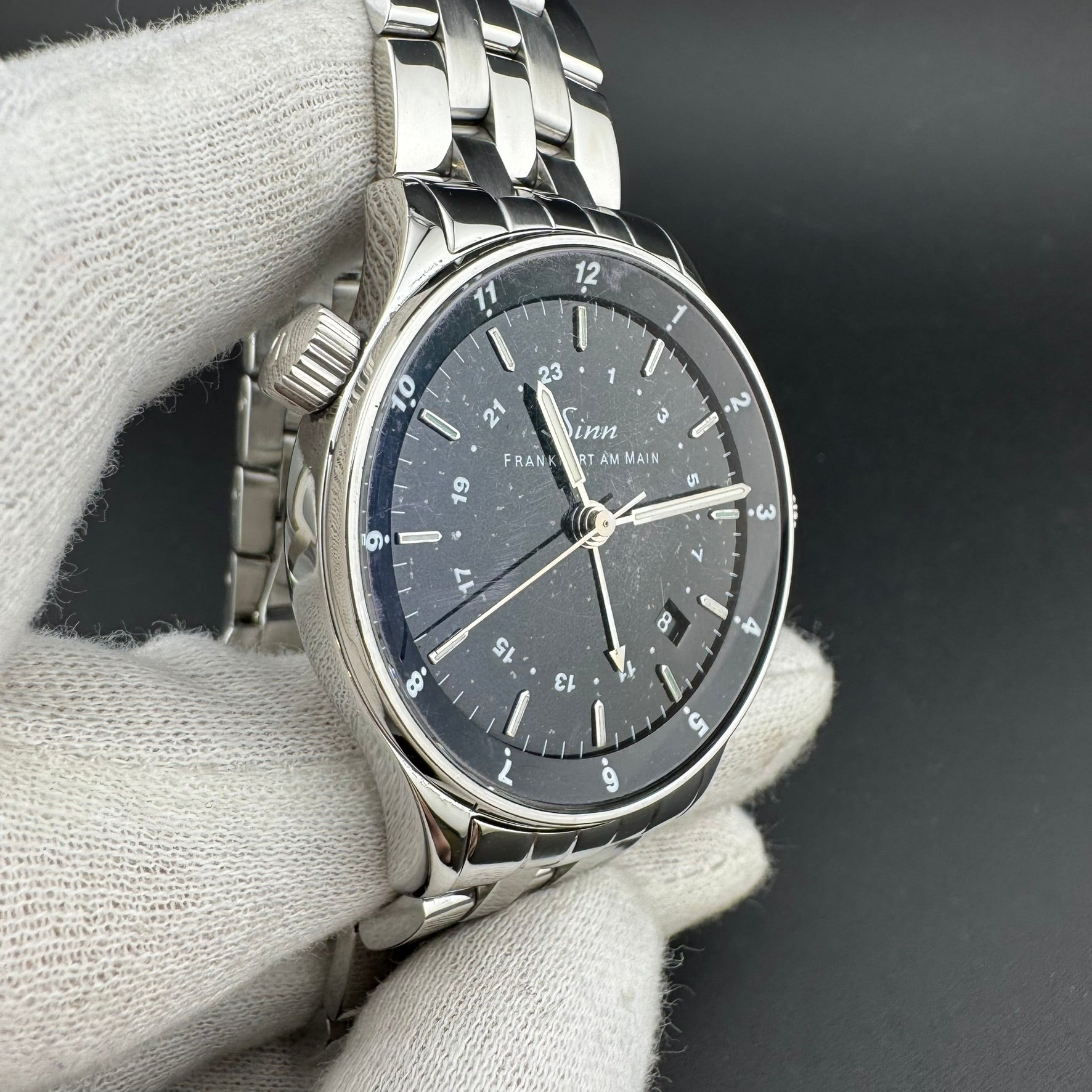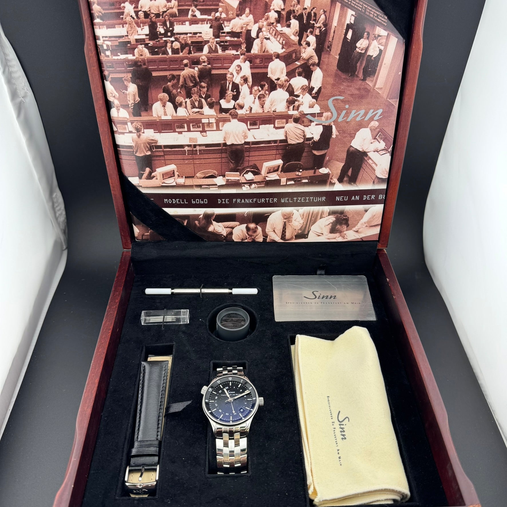 Pre-owned Sinn Frankfurt World Time Watch. Reference 6060.010. Overall, this watch is in A, Very Good condition. The watch comes with the original box, pamphlet, warranty card, loupe, band tool, an additional leather strap, and all original bracelet links. The hinges on the box are broken.
