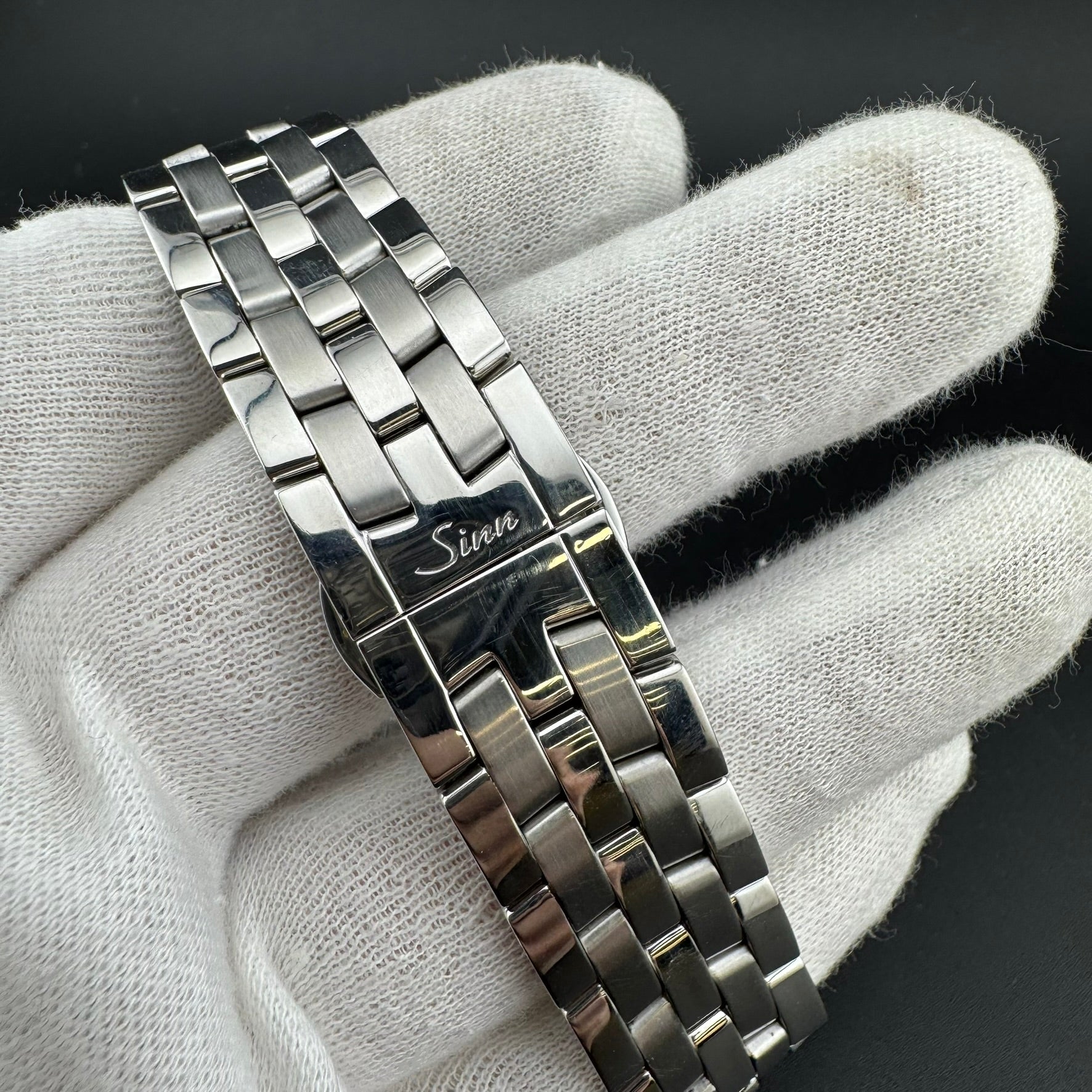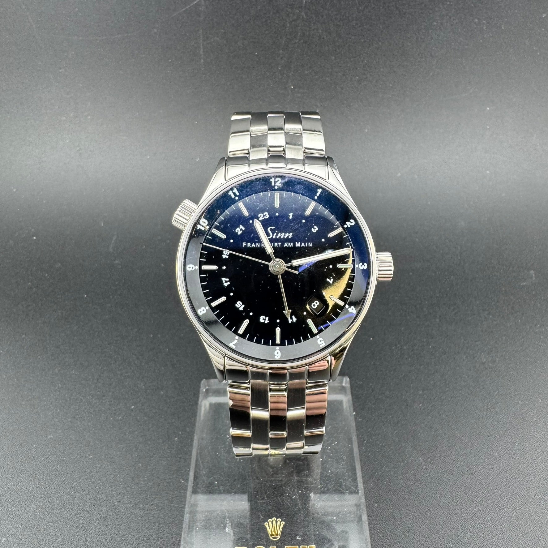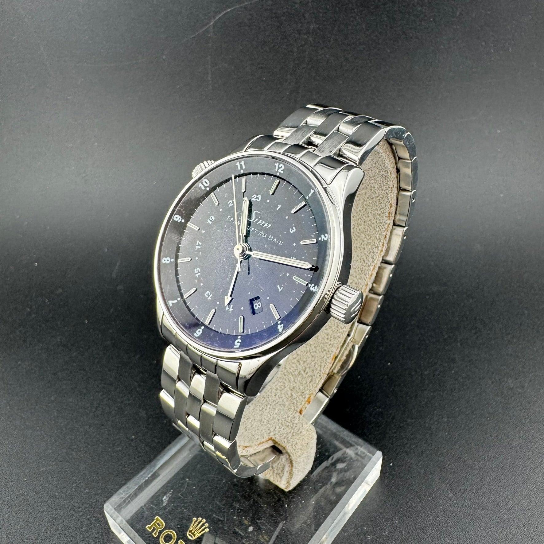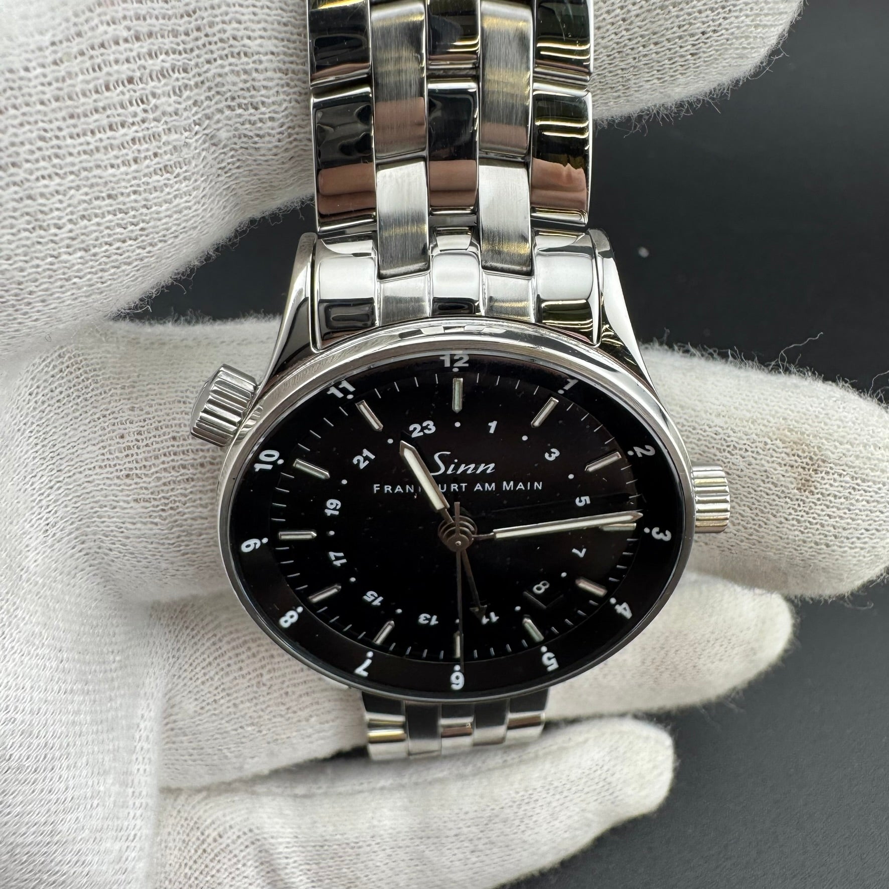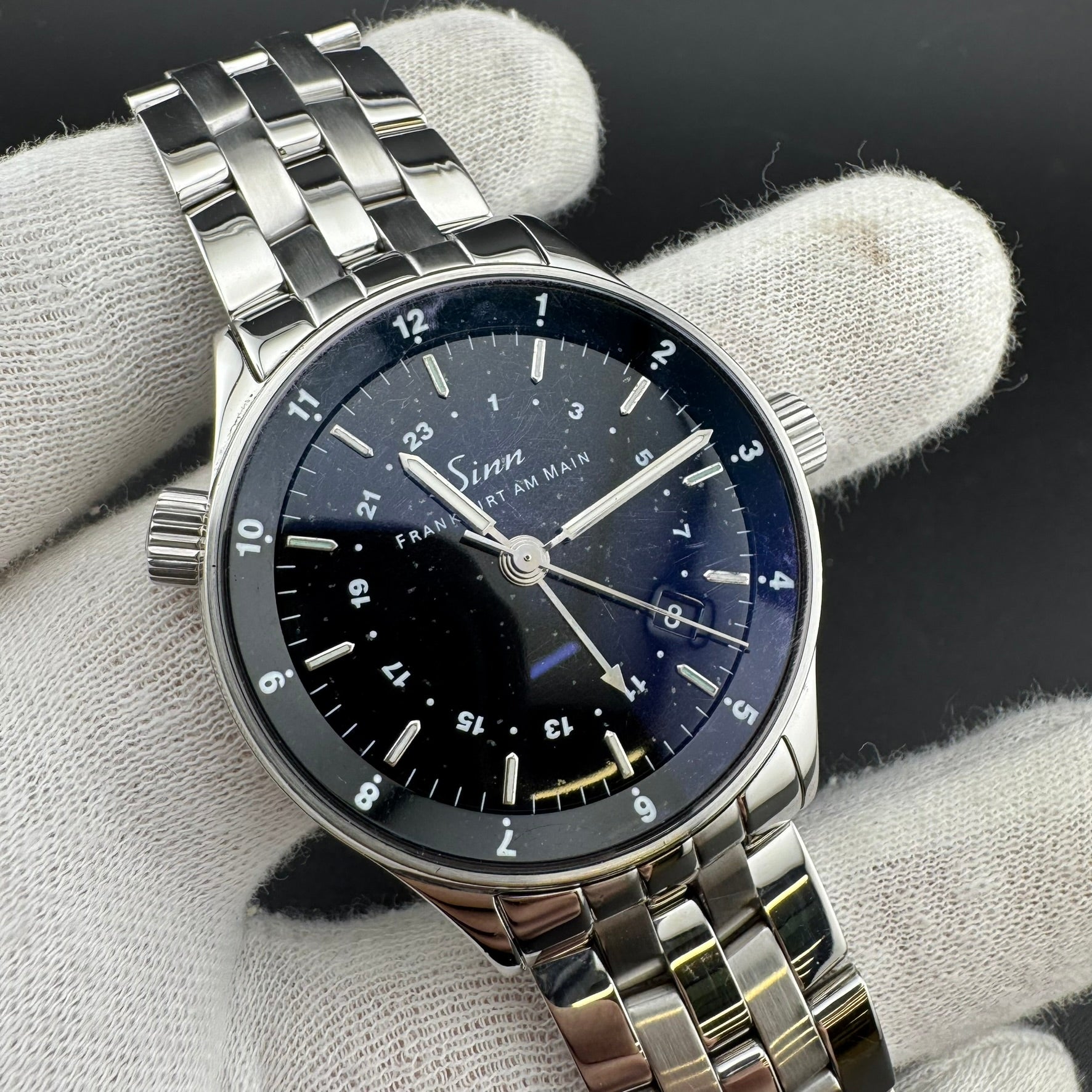 Pre-owned Sinn Frankfurt World Time Watch. Reference 6060.010. Overall, this watch is in A, Very Good condition. The watch comes with the original box, pamphlet, warranty card, loupe, band tool, an additional leather strap, and all original bracelet links. The hinges on the box are broken.