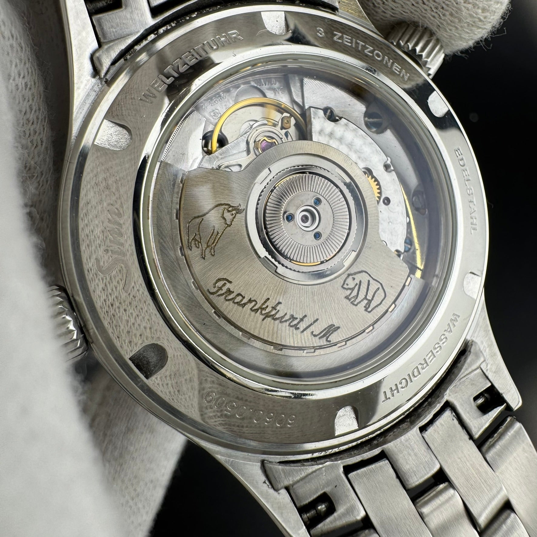 The Frankfurt World Time watch is part of Sinn's Frankfurt Financial District Watches series. This watch allows the wearer to simultaneously track 3 independent time zones, a vital task for someone trading on the World's Stock Exchanges. One time zone can be tracked with the 12 hour hands, another with the quick-settable 24hr hand, and the third using the rotating 12hr bezel. The watch also features a beautifully decorated movement, with the most notable decoration being the Bull and the Bear engraved on the automatic works rotor. These engravings represent the traditional symbols of the stock exchange which encapsulates the two usual sentiments of investors.