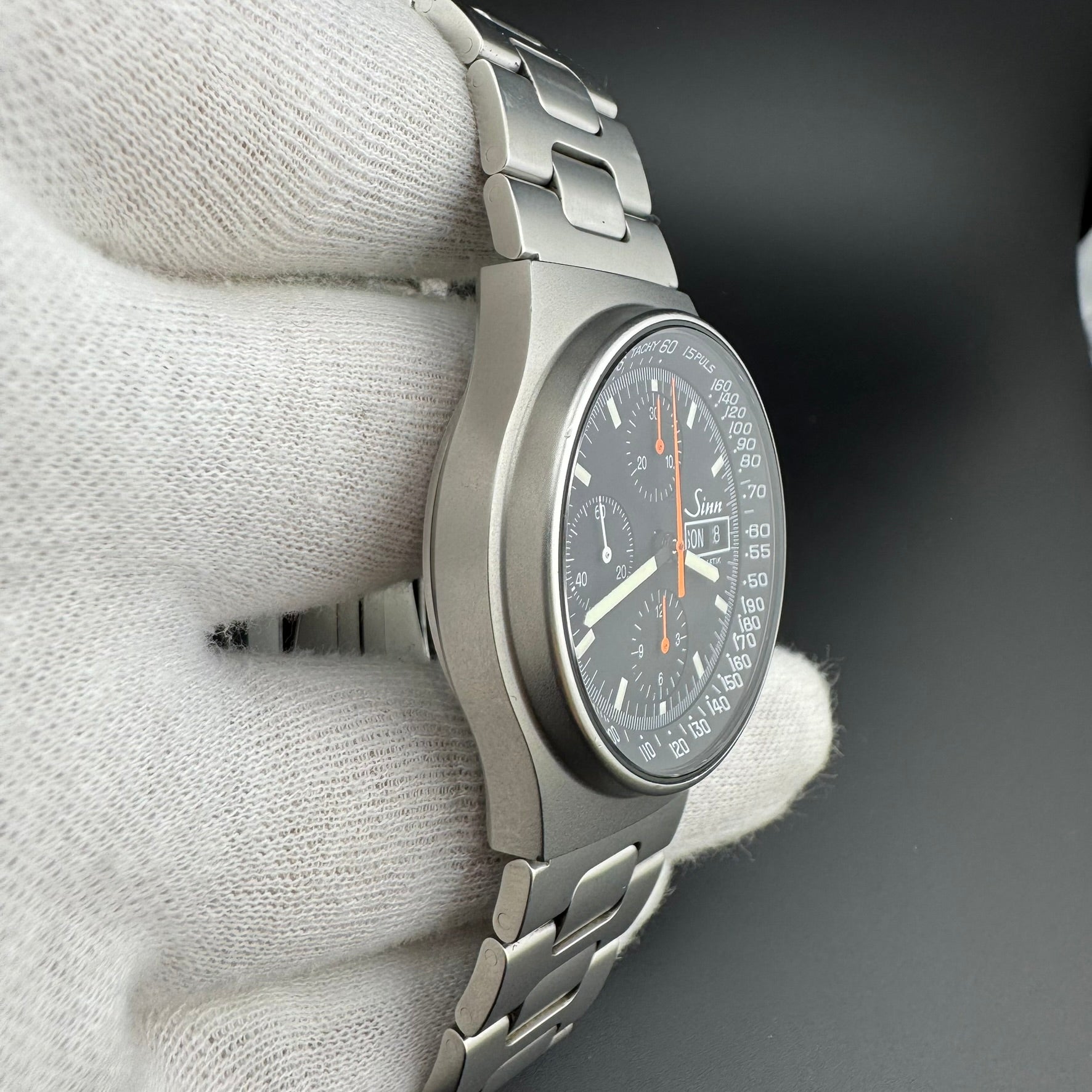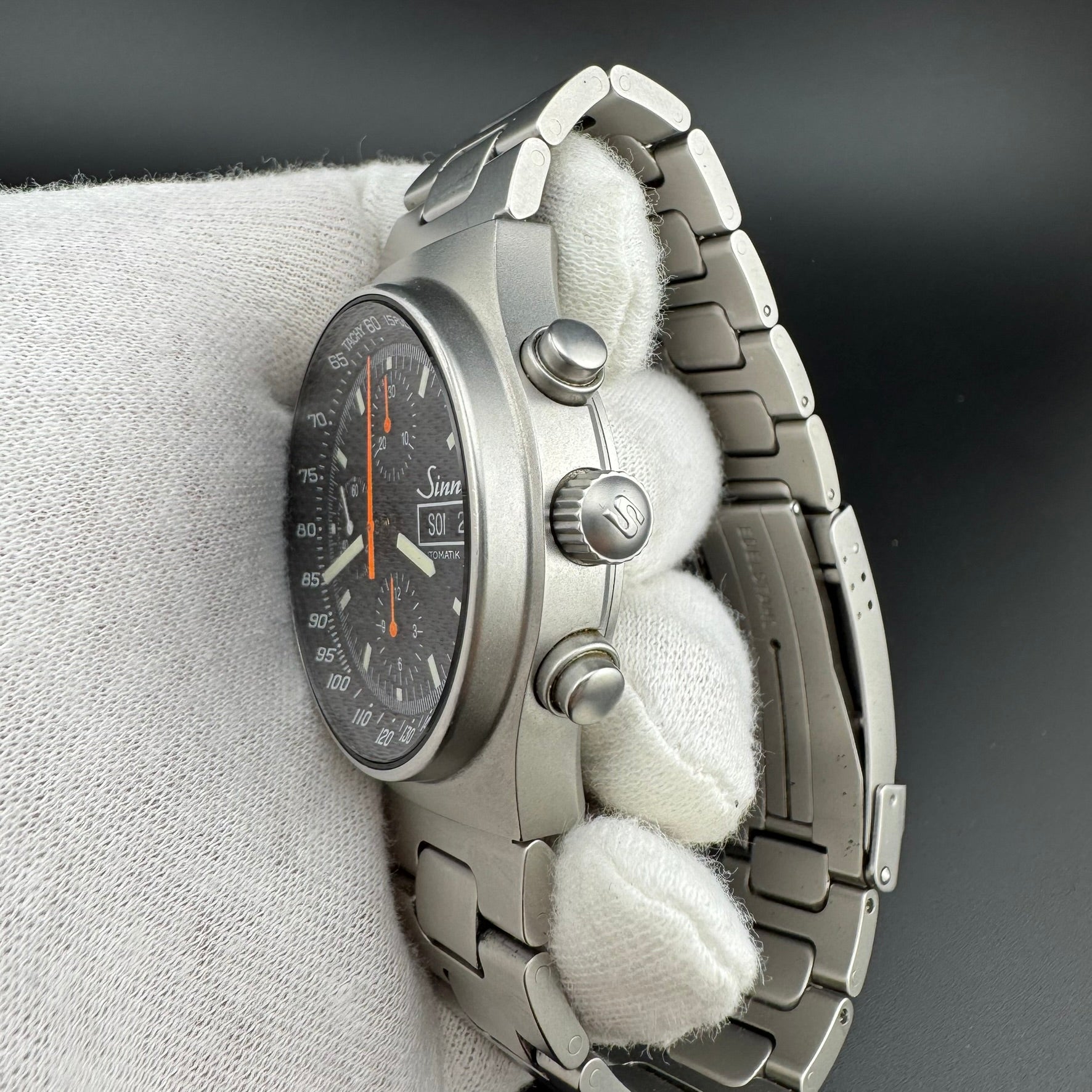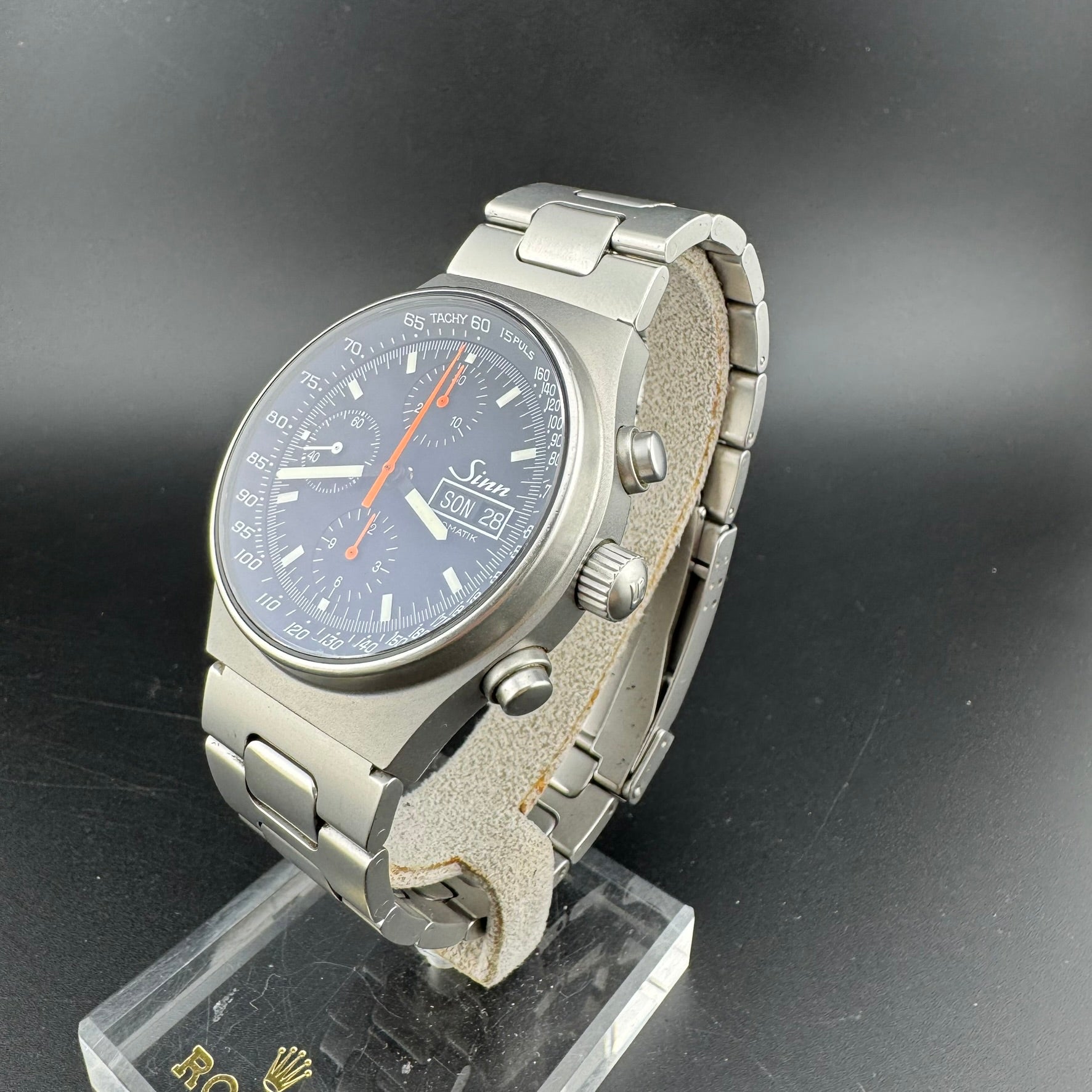 Pre-owned Sinn Automatic Chronograph Watch. Reference 144.M.SA. Overall, this watch is in B, Good condition. Minor scratches and scuffs can be seen on the sides of the case and bracelet. This watch comes with the original box and warranty card.