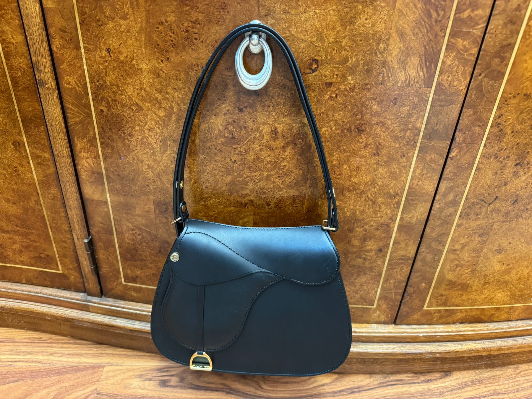 This Dressage Saddle bag in black leather is in (B) Very Good condition. The bag shows some light wear and imperfections.  Width: 280mm, Height: 220mm. Depth: 60mm.